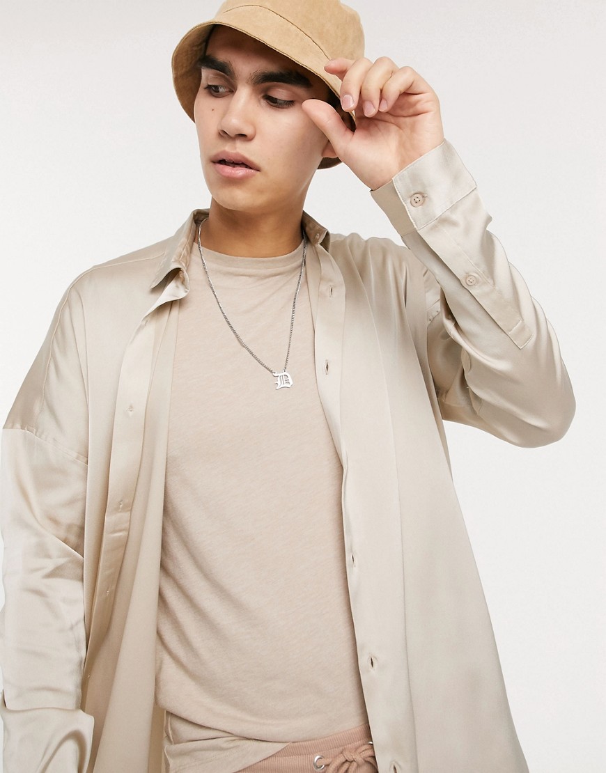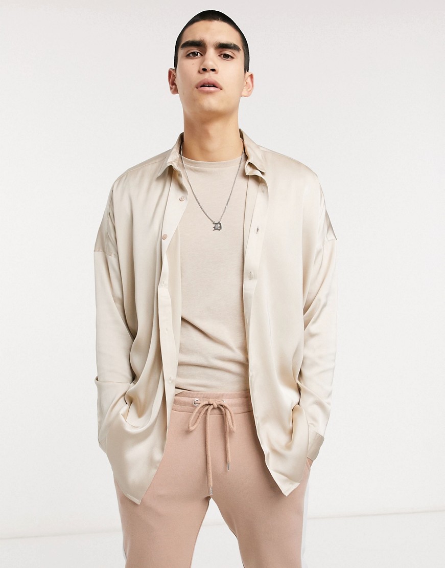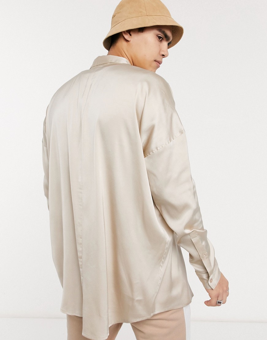 Satynowa koszula oversize w kolorze szampana o wydłużonym fasonie z obniżoną linią ramion S