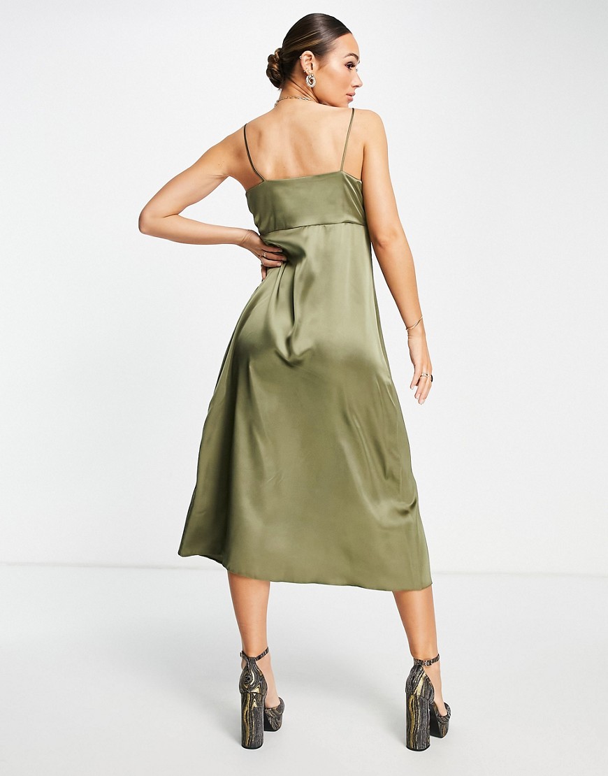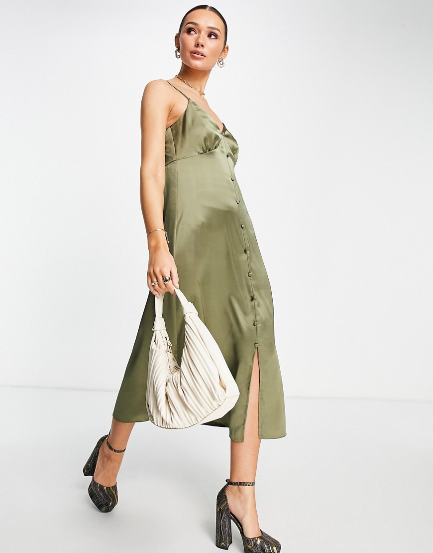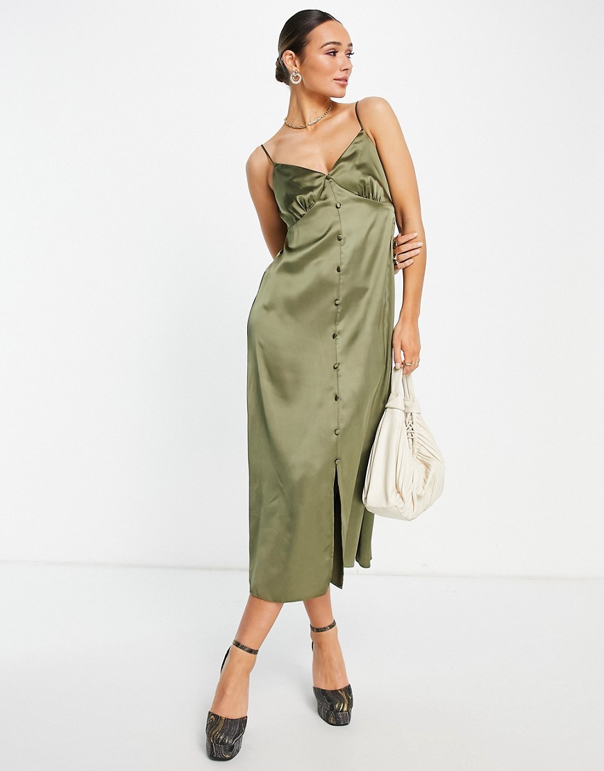 Satynowa sukienka midi na ramiączkach z guzikami khaki 34