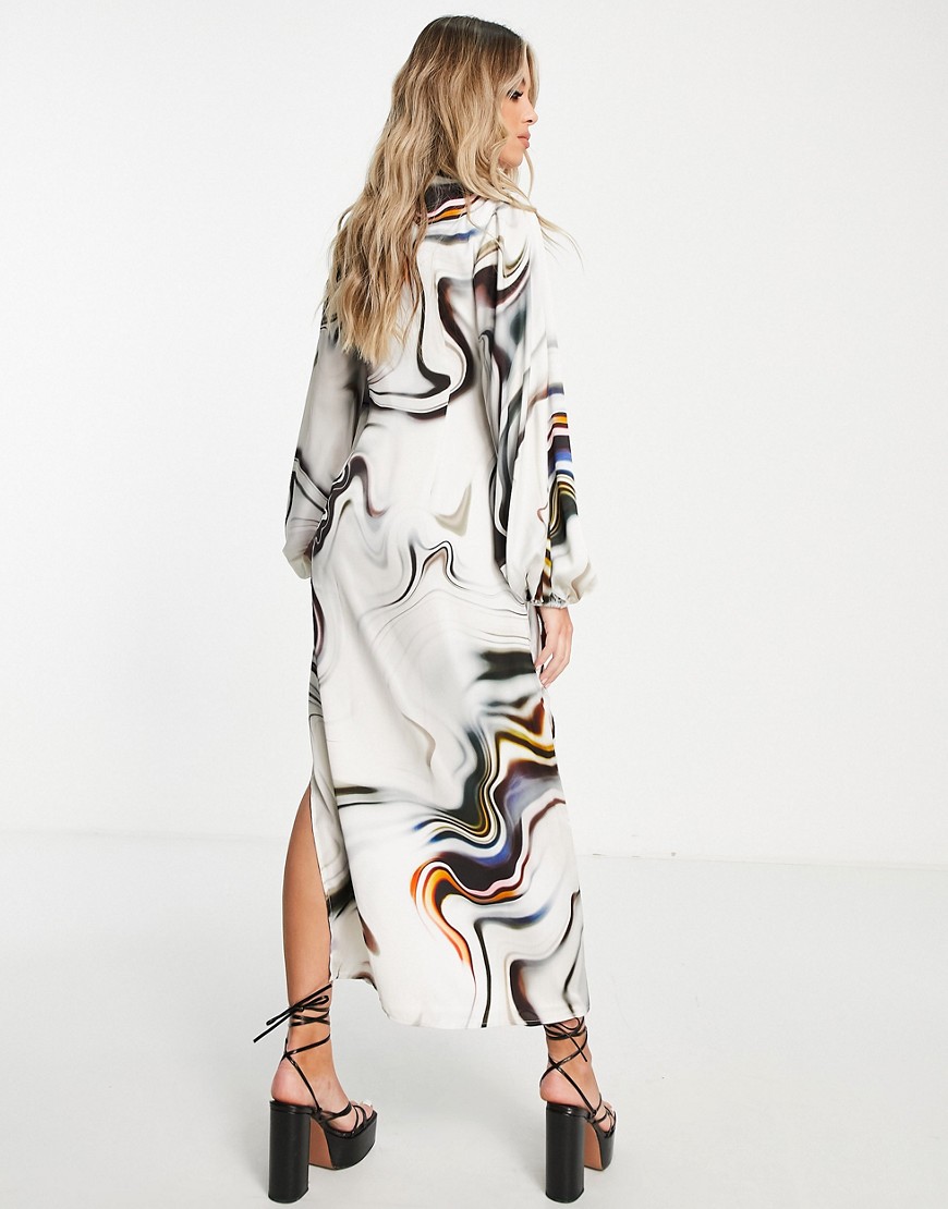 Satynowa sukienka midi w abstrakcyjny marmurowy wzór z wycięciem 36