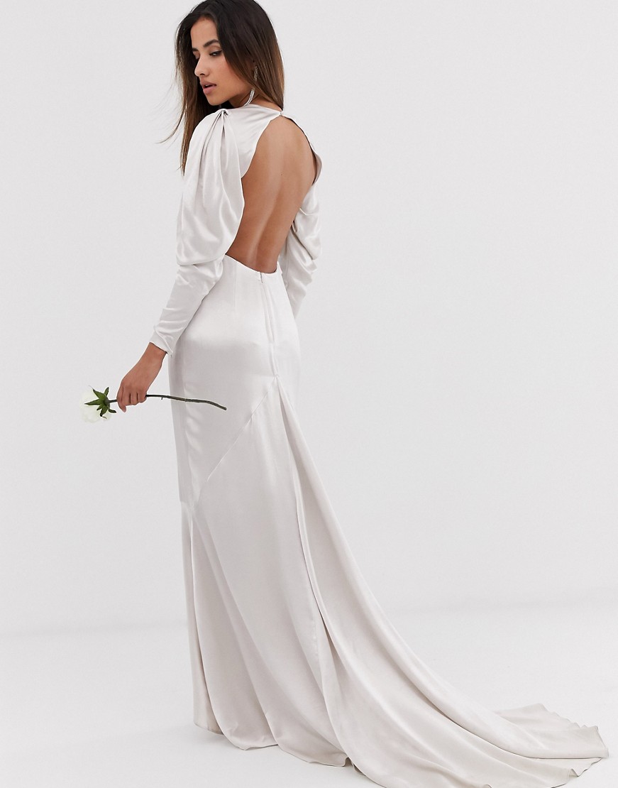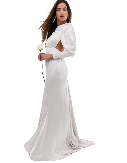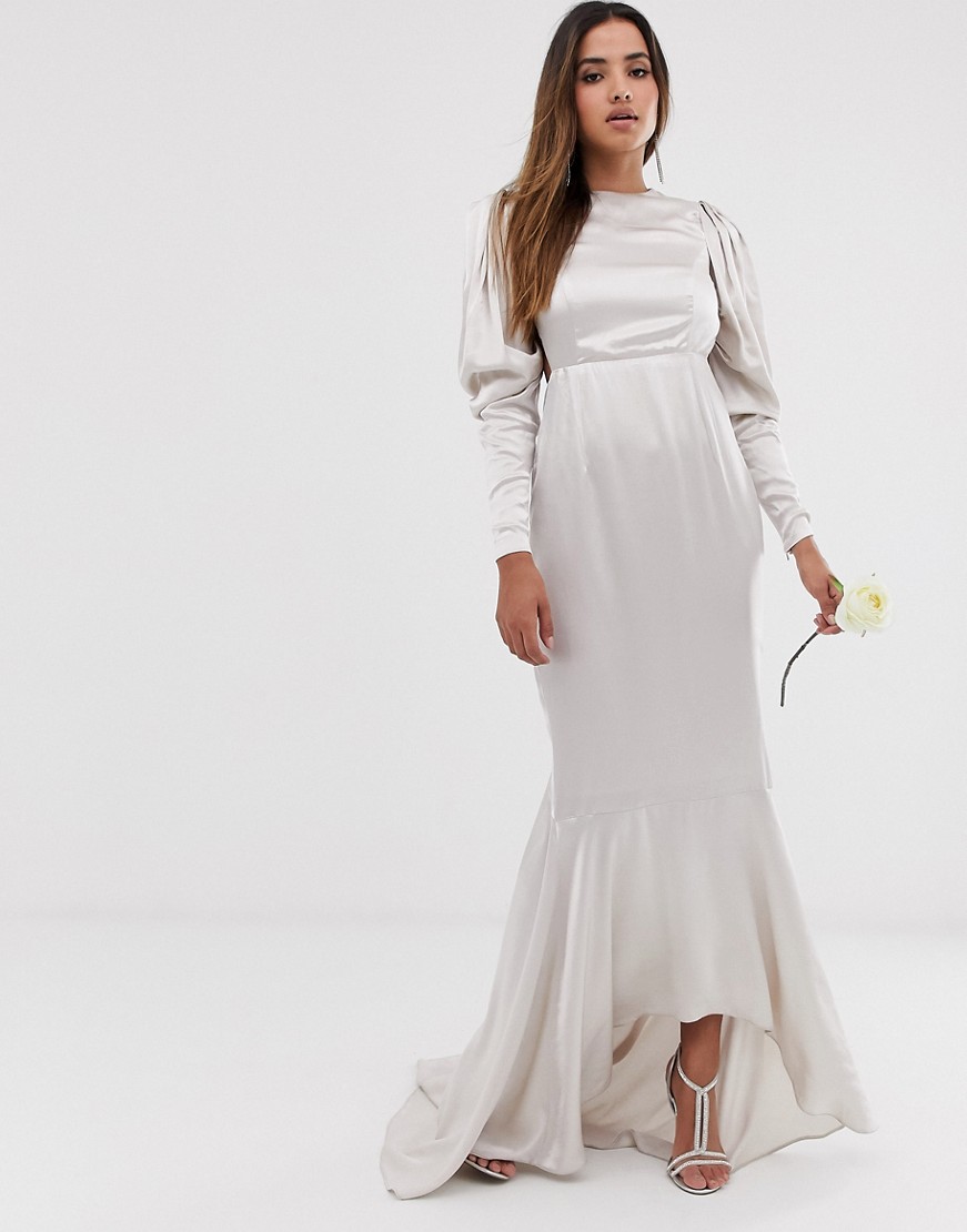 Satynowa suknia ślubna typu fishtail z efektownym rękawem defekt 40