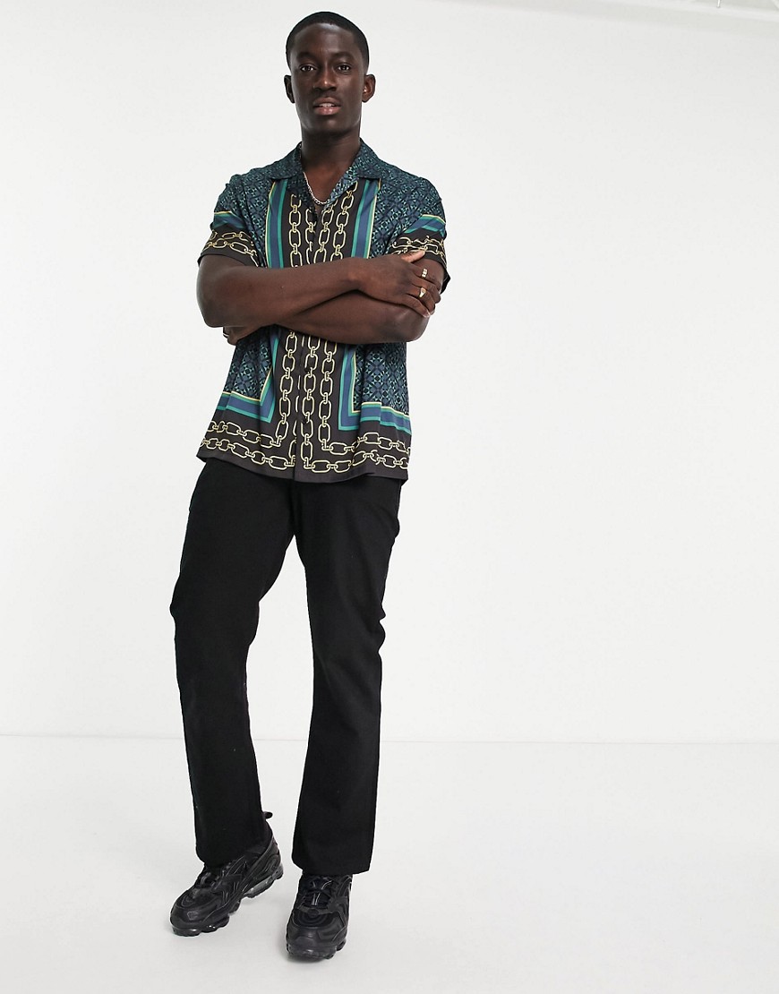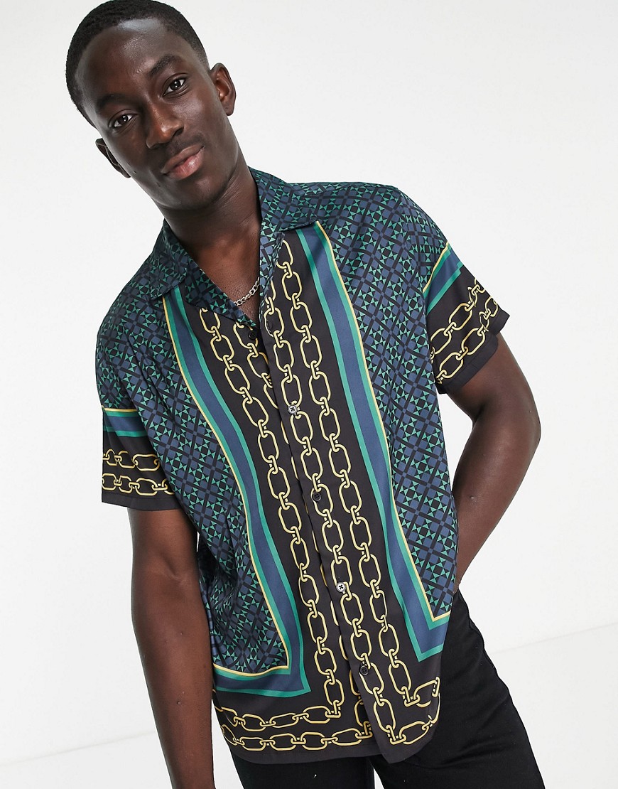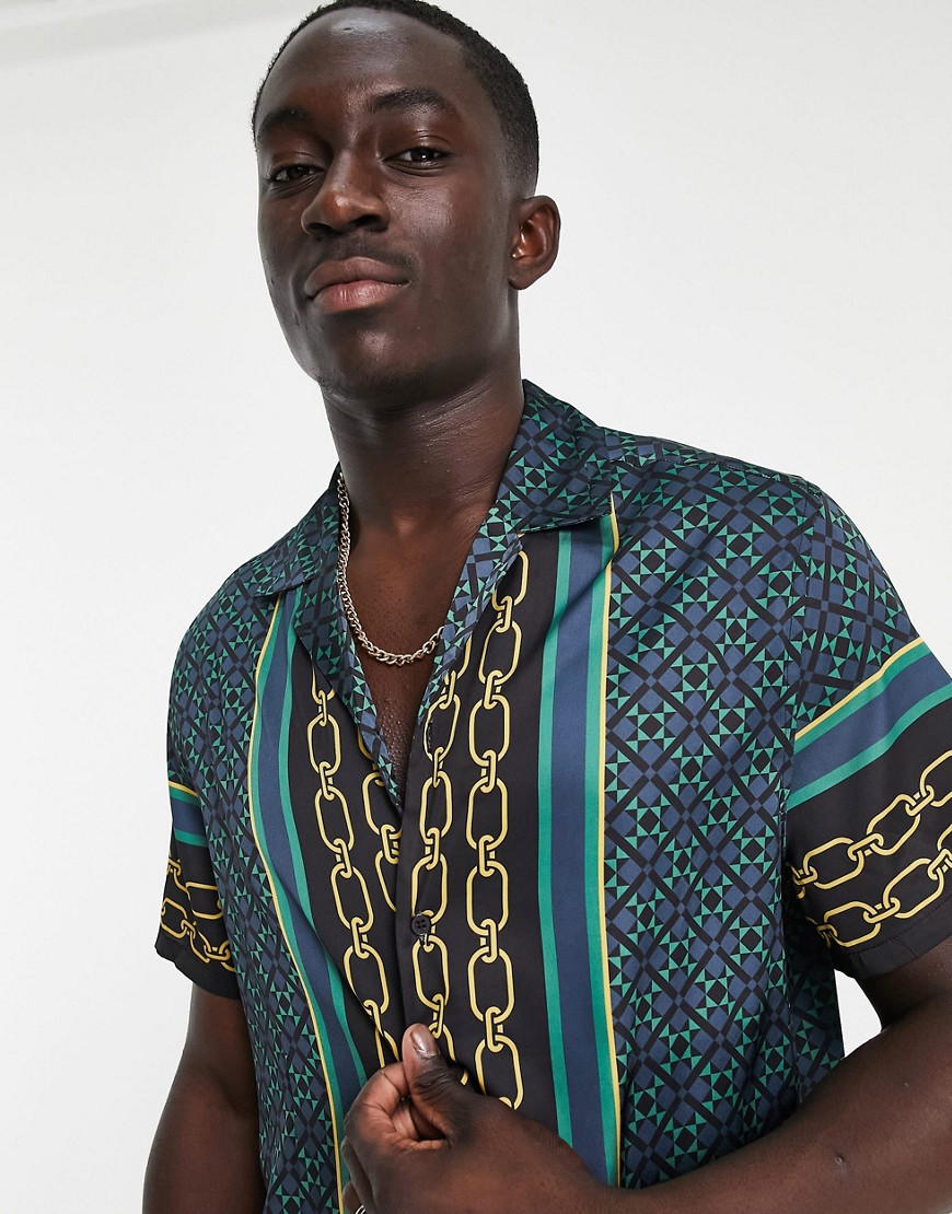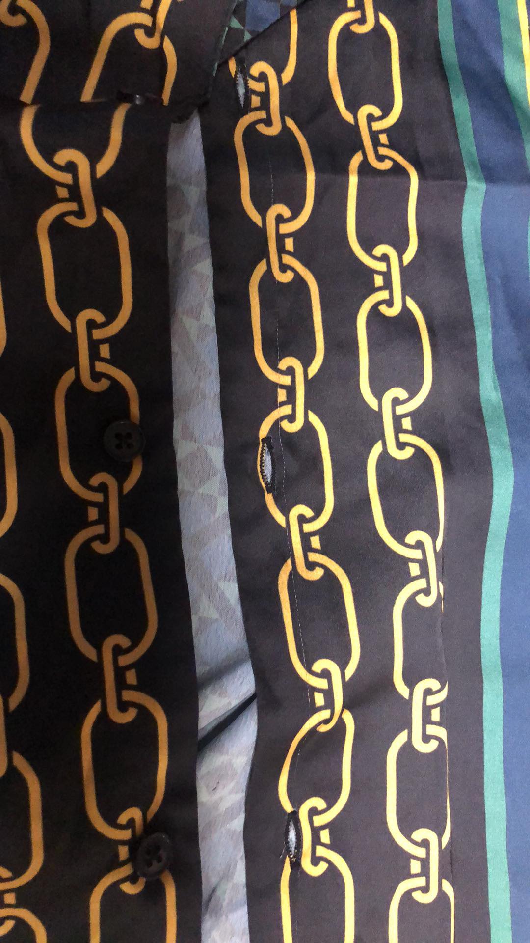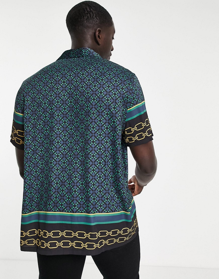 Satynowa wzorzysta koszula o luźnym kroju z kołnierzykiem kubańskim defekt 2XL