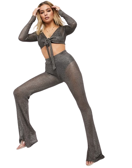 • wąskie nogawki, przechodzące w dzwony na poziomie kolan