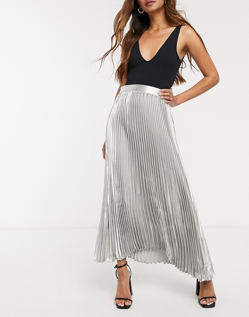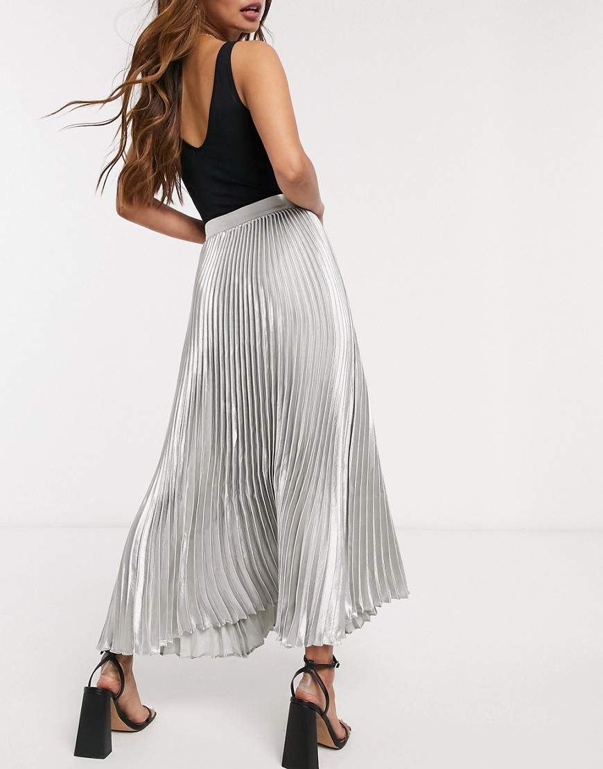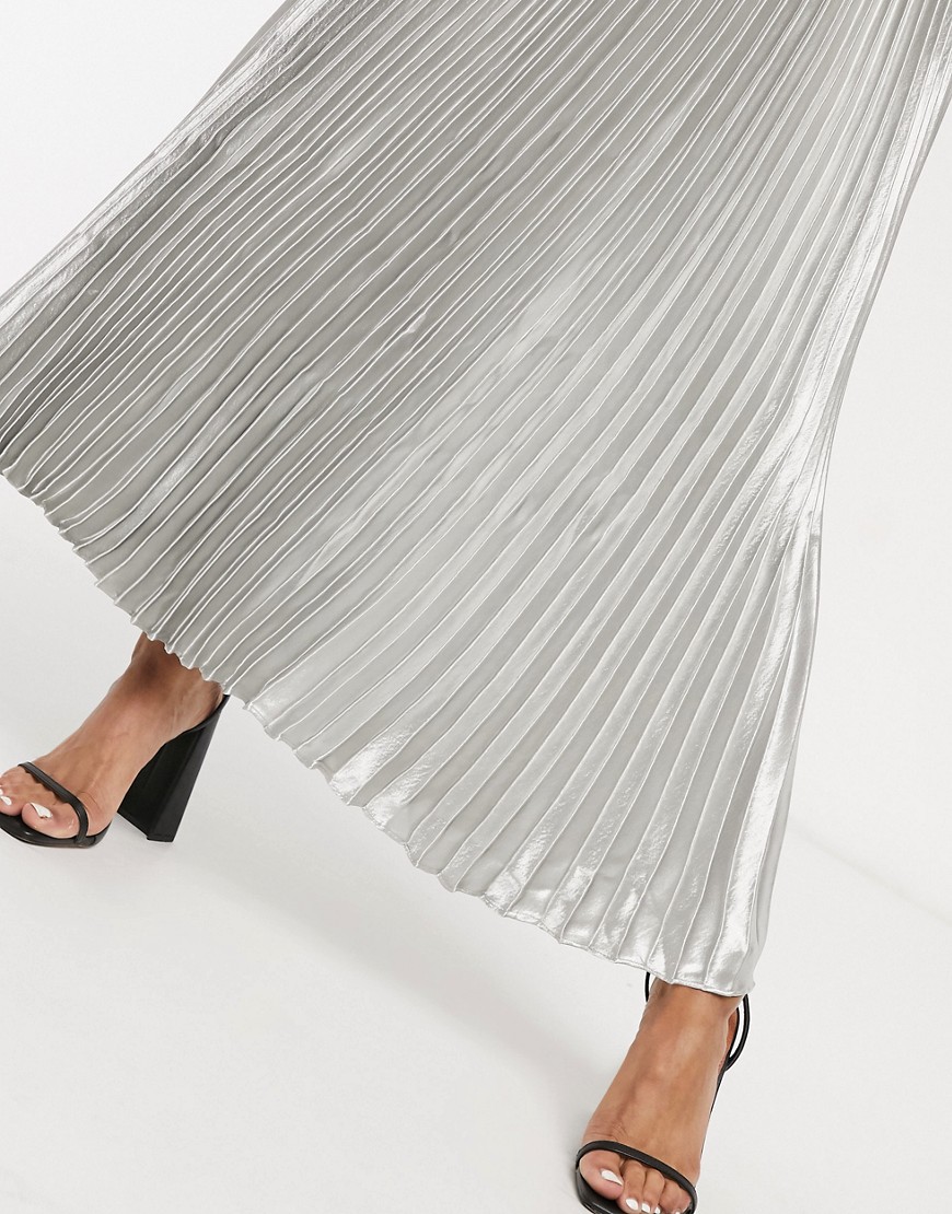 Srebrna plisowana rozkloszowana spódnica maxi metaliczna 38