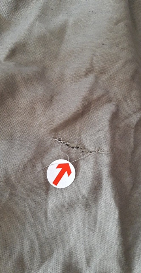 - Defekt: rozcięta na ok. 4 cm na wysokości drugiego guzika od dołu