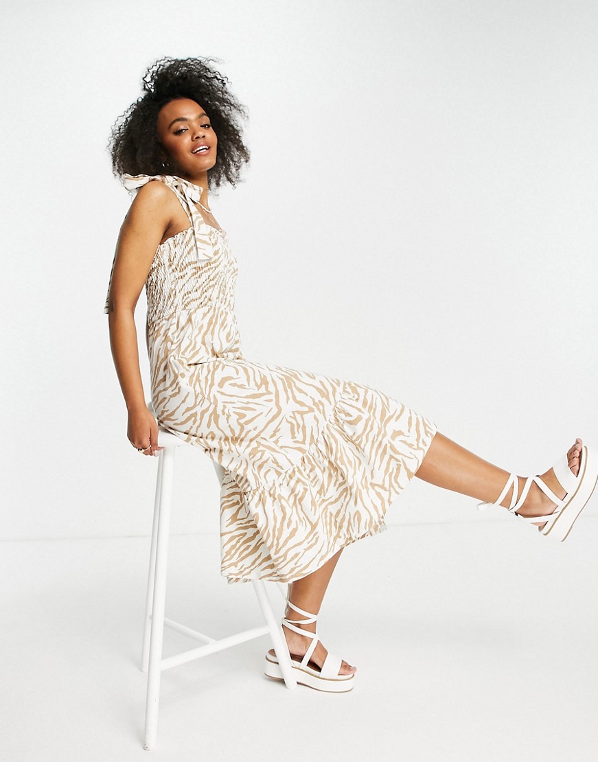 Sukienka midi z kaskadowym dołem wiązane ramiączka w paski zebry brązowa 44