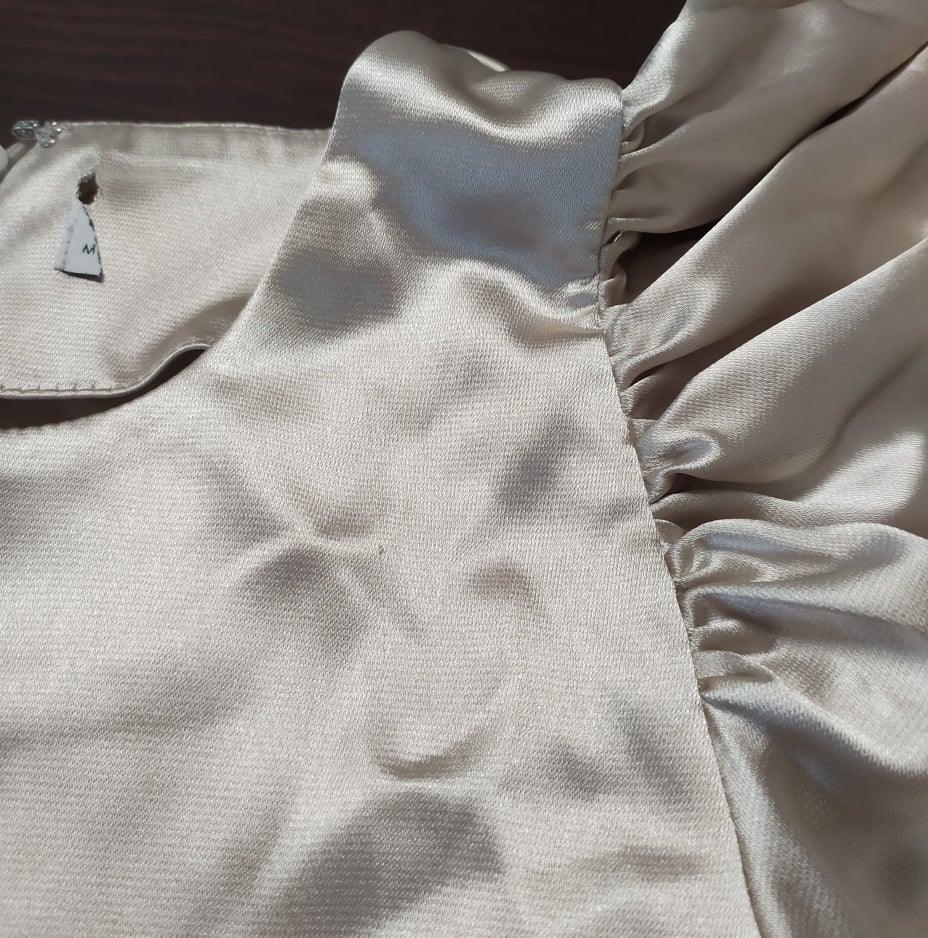 - Defekt zaciągnięta nitka na przodzie sukienki, górna część, z racji materiału słabo widoczna wada, zdjęcie w galerii produktu