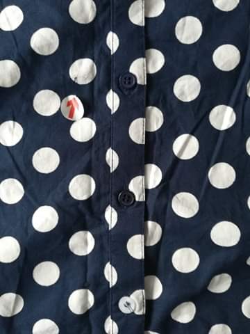 - defekt: 0,5 cm zaciągnięcie z przodu na wysokości trzeciego guzika od dołu; brakujący jeden granatowy guzik przy rękawie (ostatnie zdjęcie w galerii to realne zdjęcie wady)