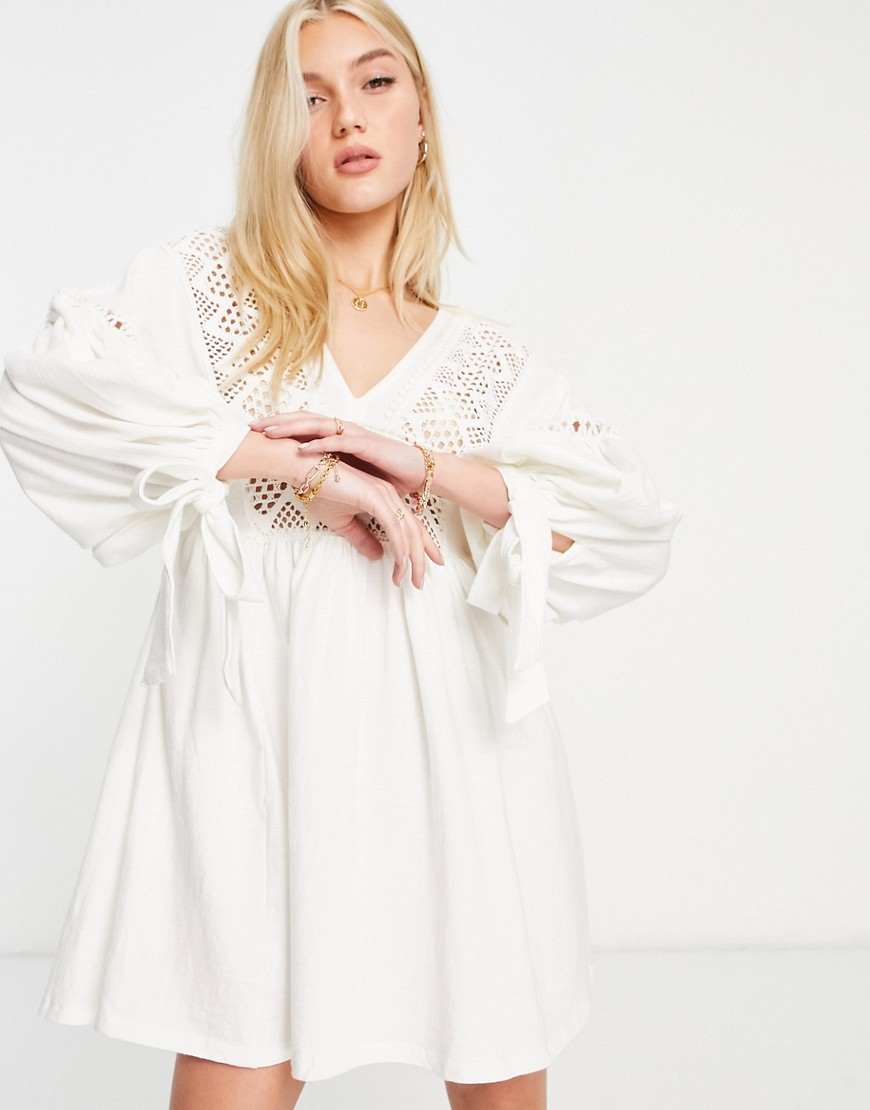 Sukienka mini z obszernymi rękawami i haftowanym dekoltem ivory 44