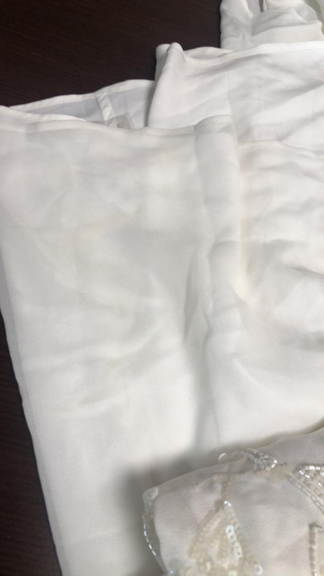 - Defekt: zabrudzenie materiału na dole w różnych miejscach, przykładowe zdjęcie w galerii