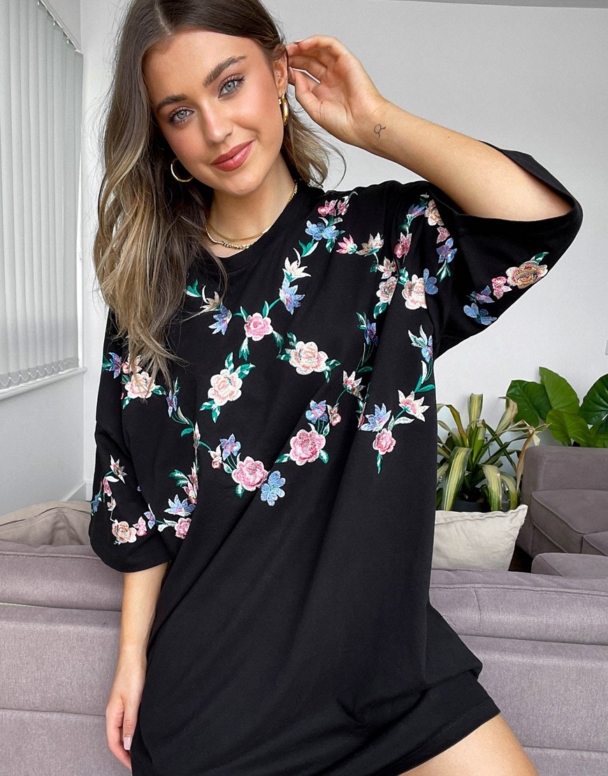 Sukienka t-shirtowa oversize z kwiatowym haftem czarna 40