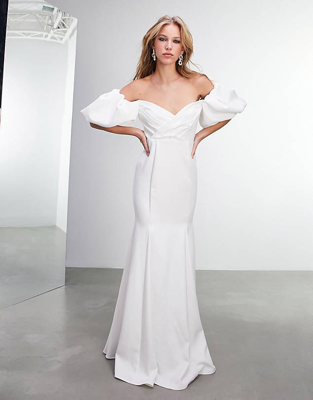 Suknia ślubna z krepy z bufiastymi rękawami 44