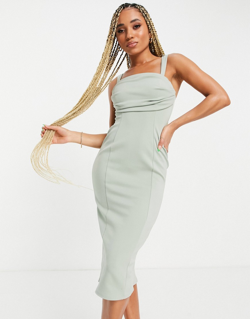 Szałwiowa gorsetowa sukienka ołówkowa midi z marszczeniem na biuście 42