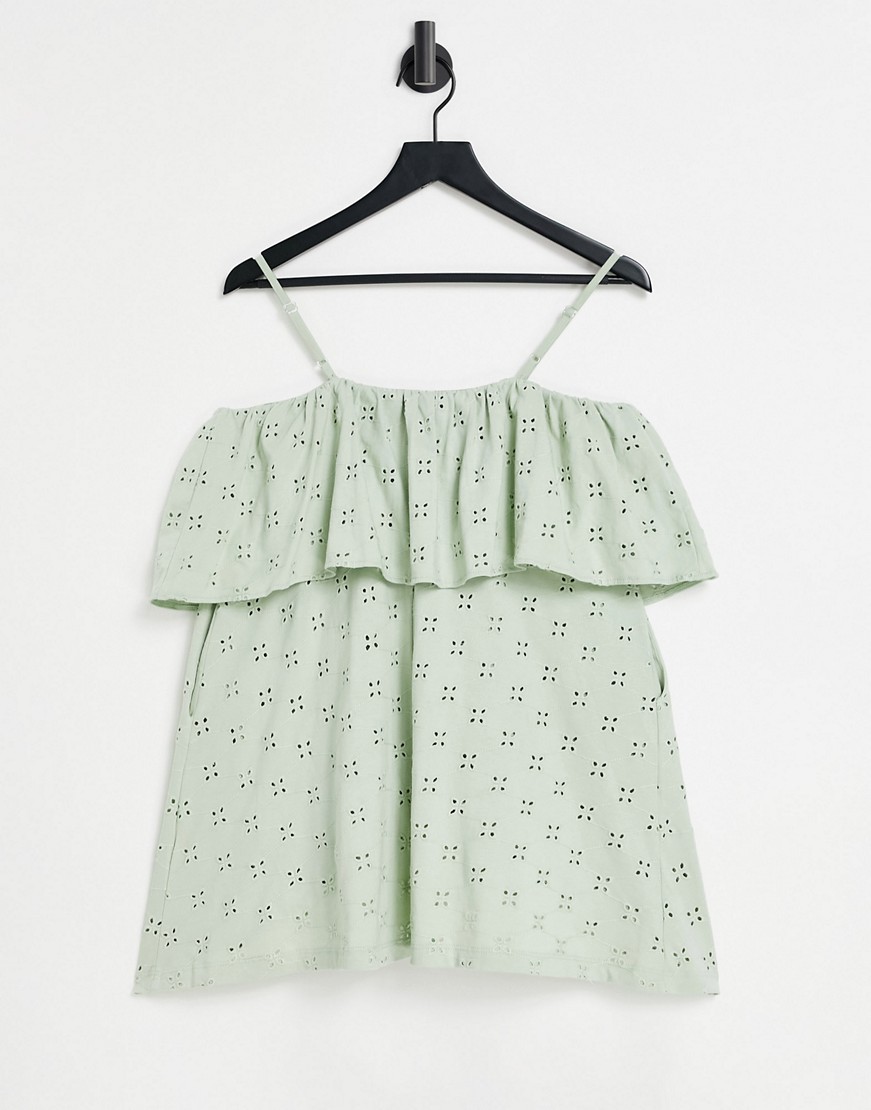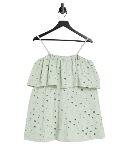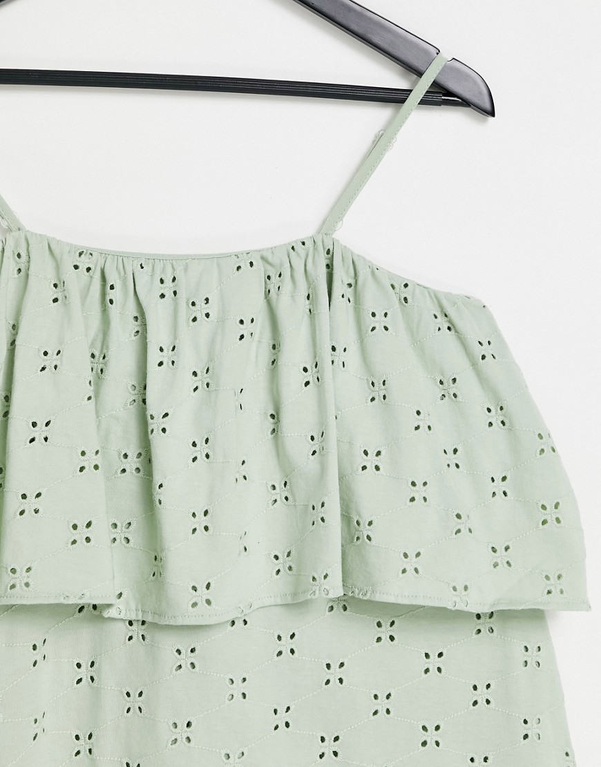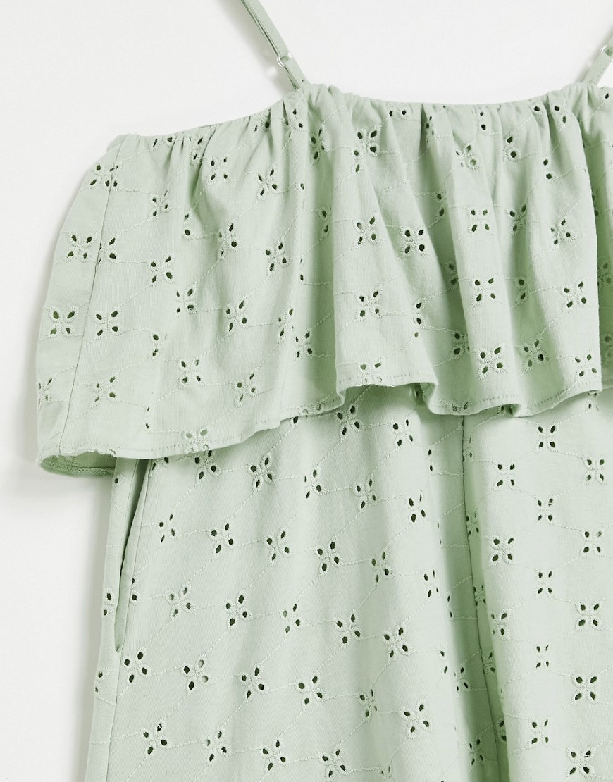 Szałwiowa sukienka mini na ramiączkach z haftem angielskim 38