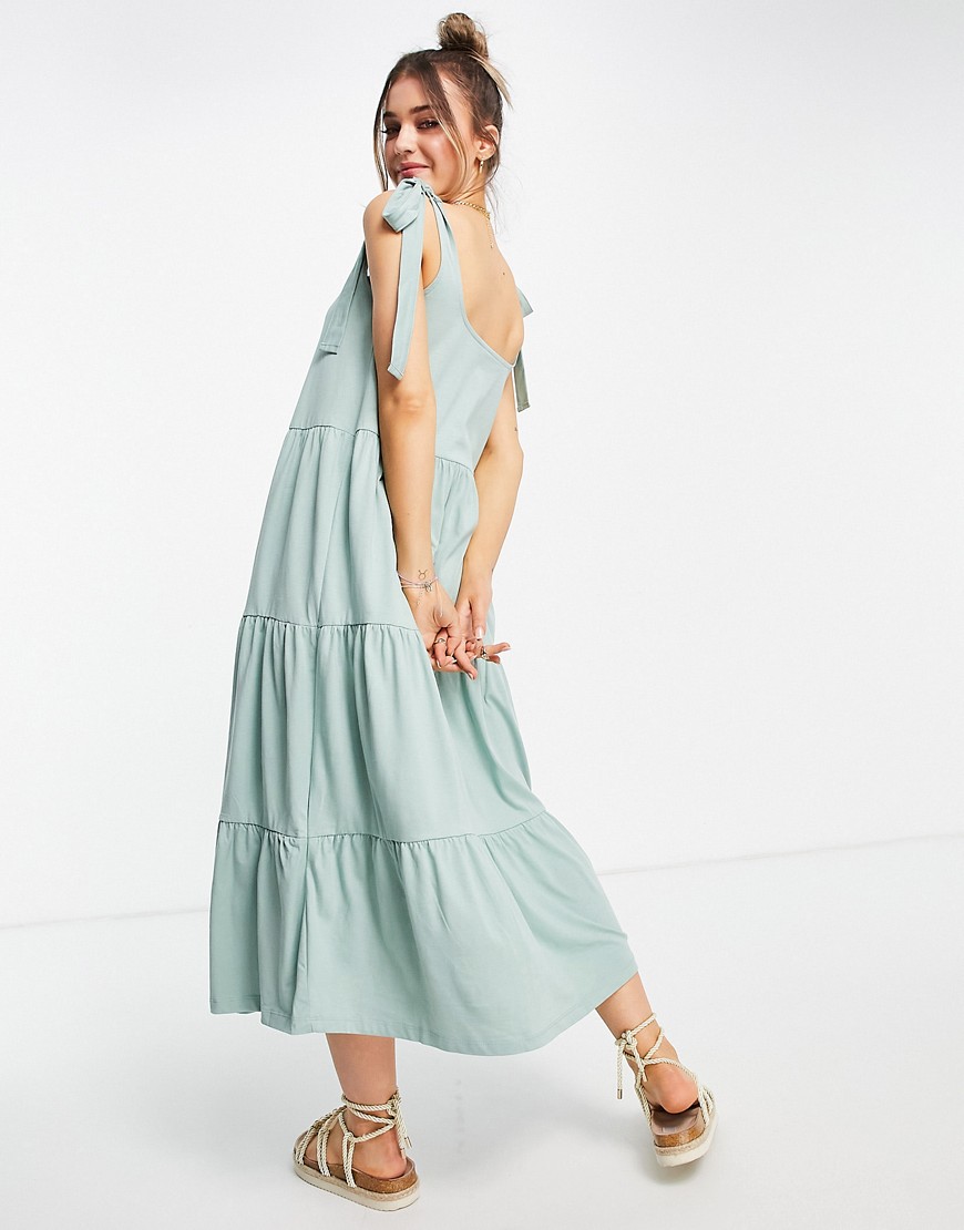 Szałwiowa wiązana na ramionach warstwowa sukienka maxi z kwadratowym dekoltem 44