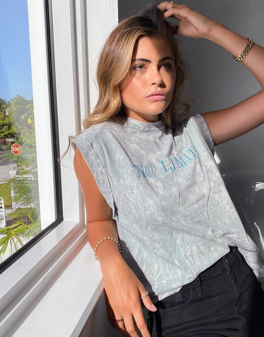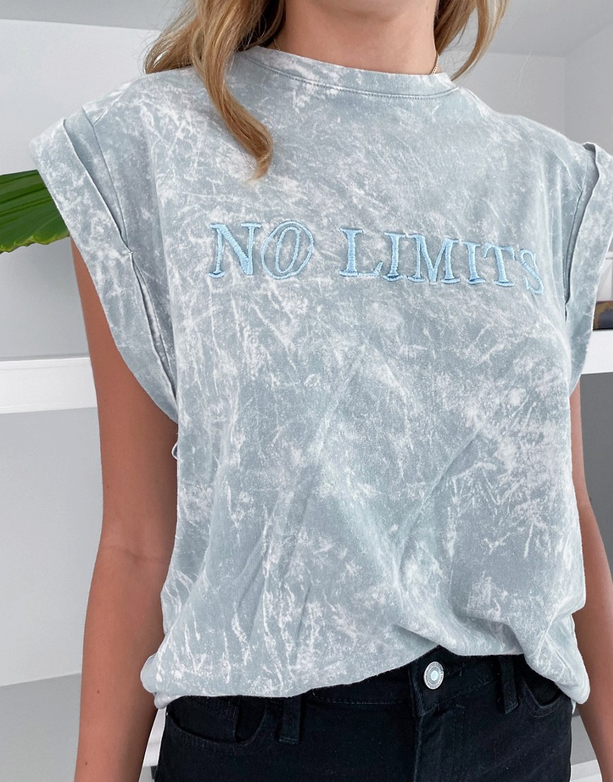 - Haftowany napis „No Limits” na klatce piersiowej