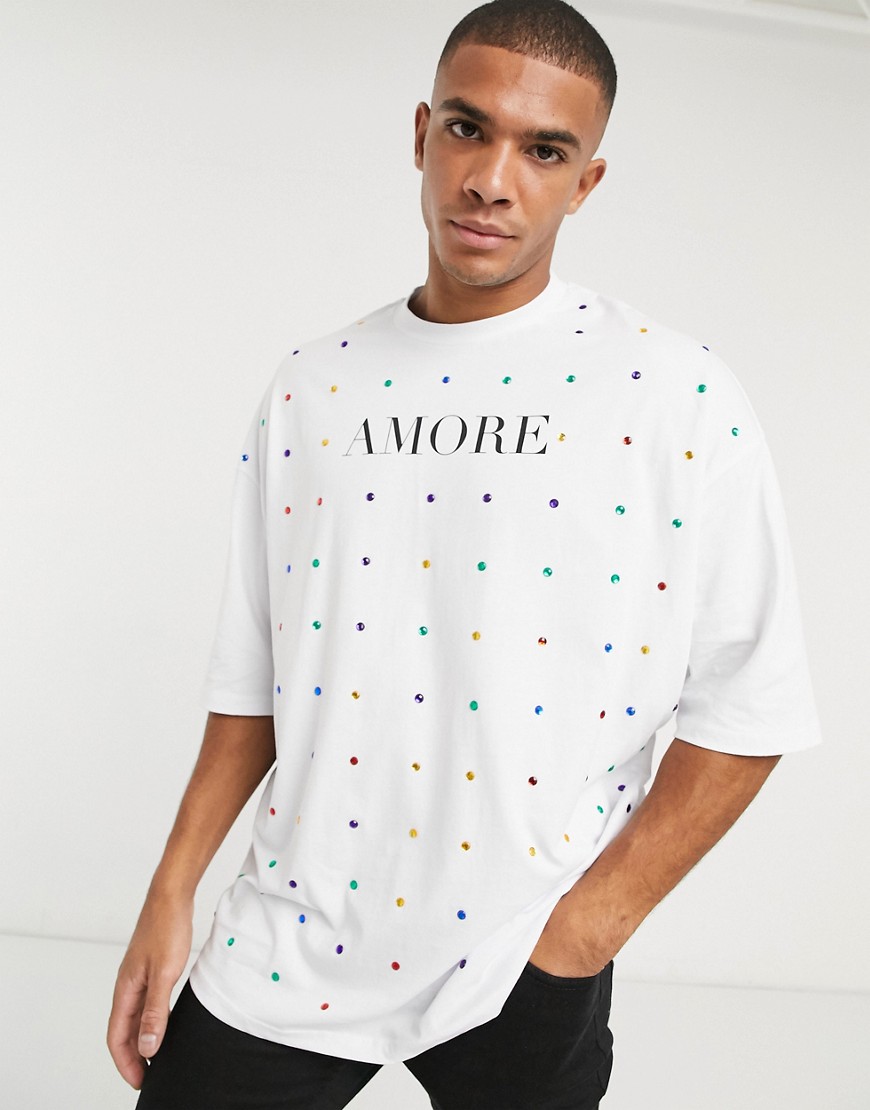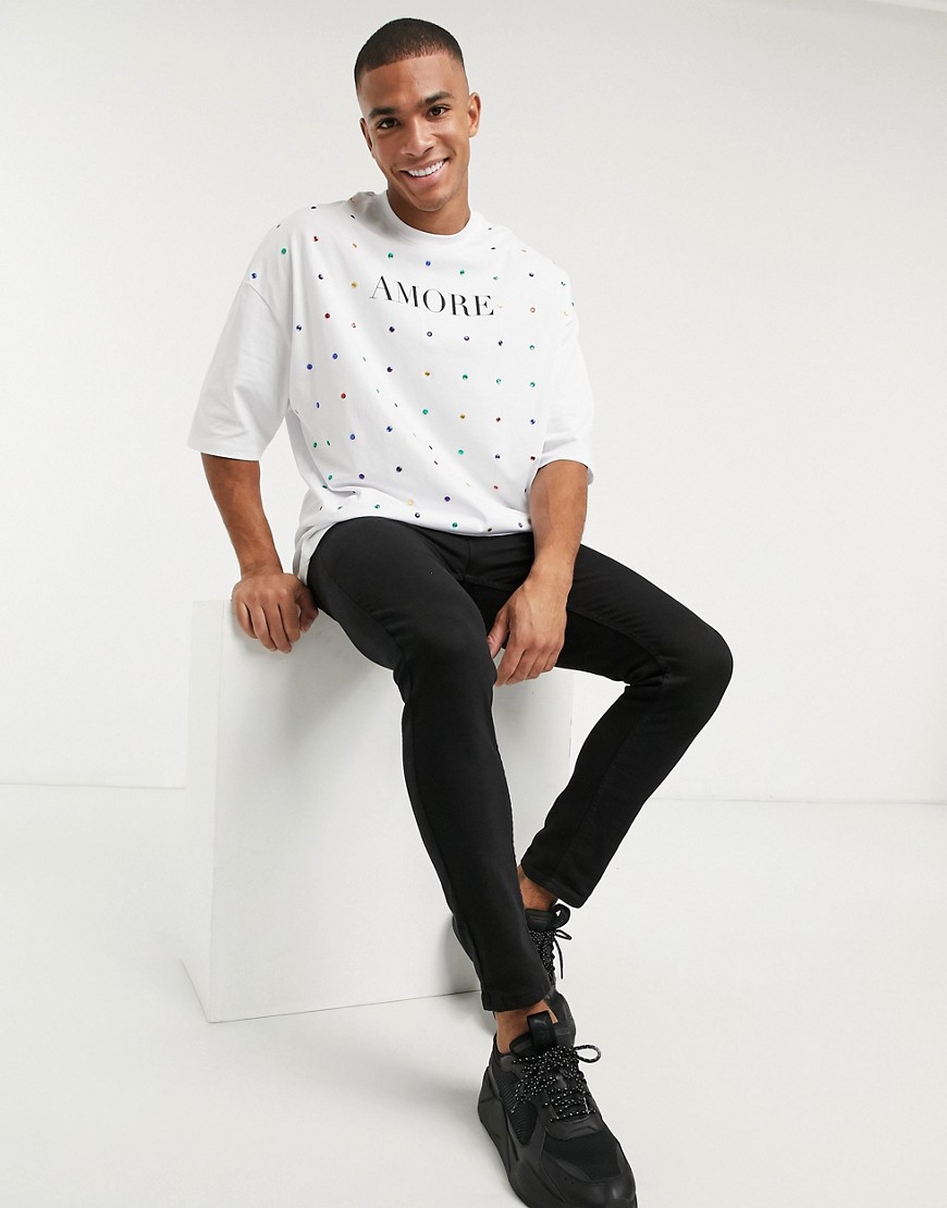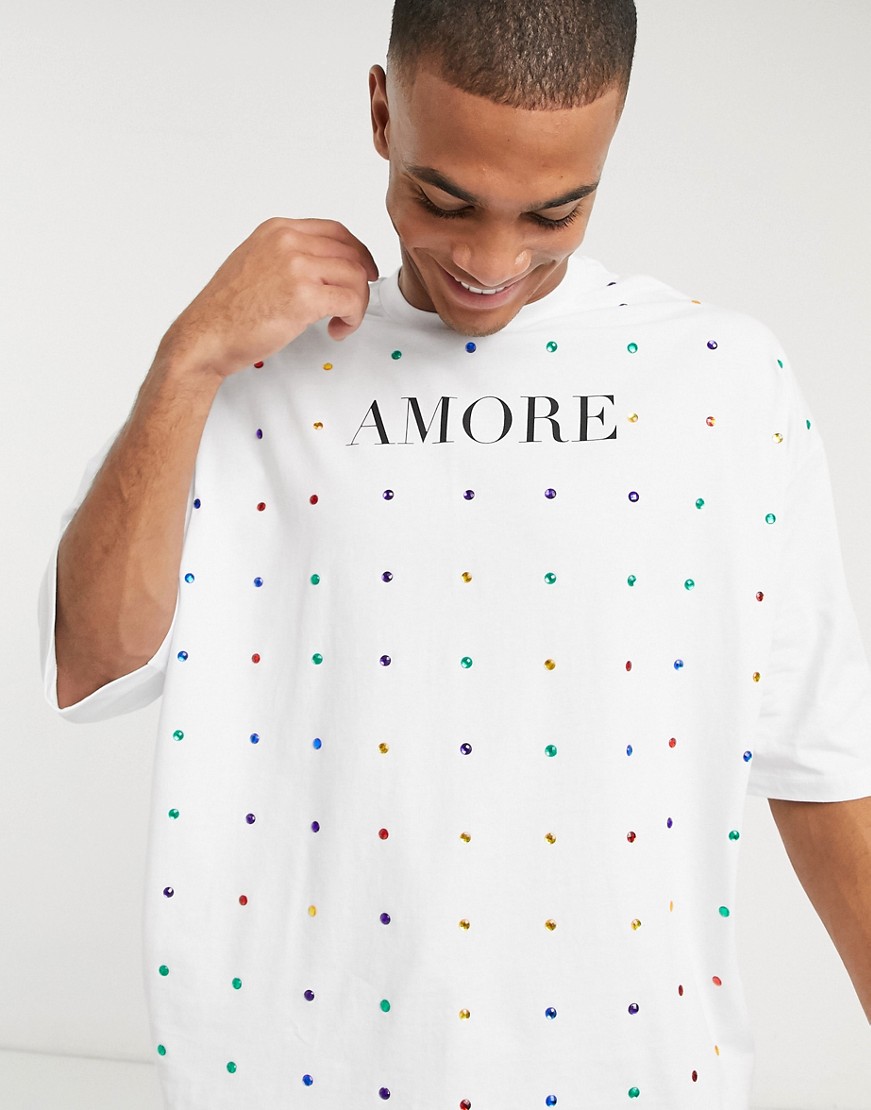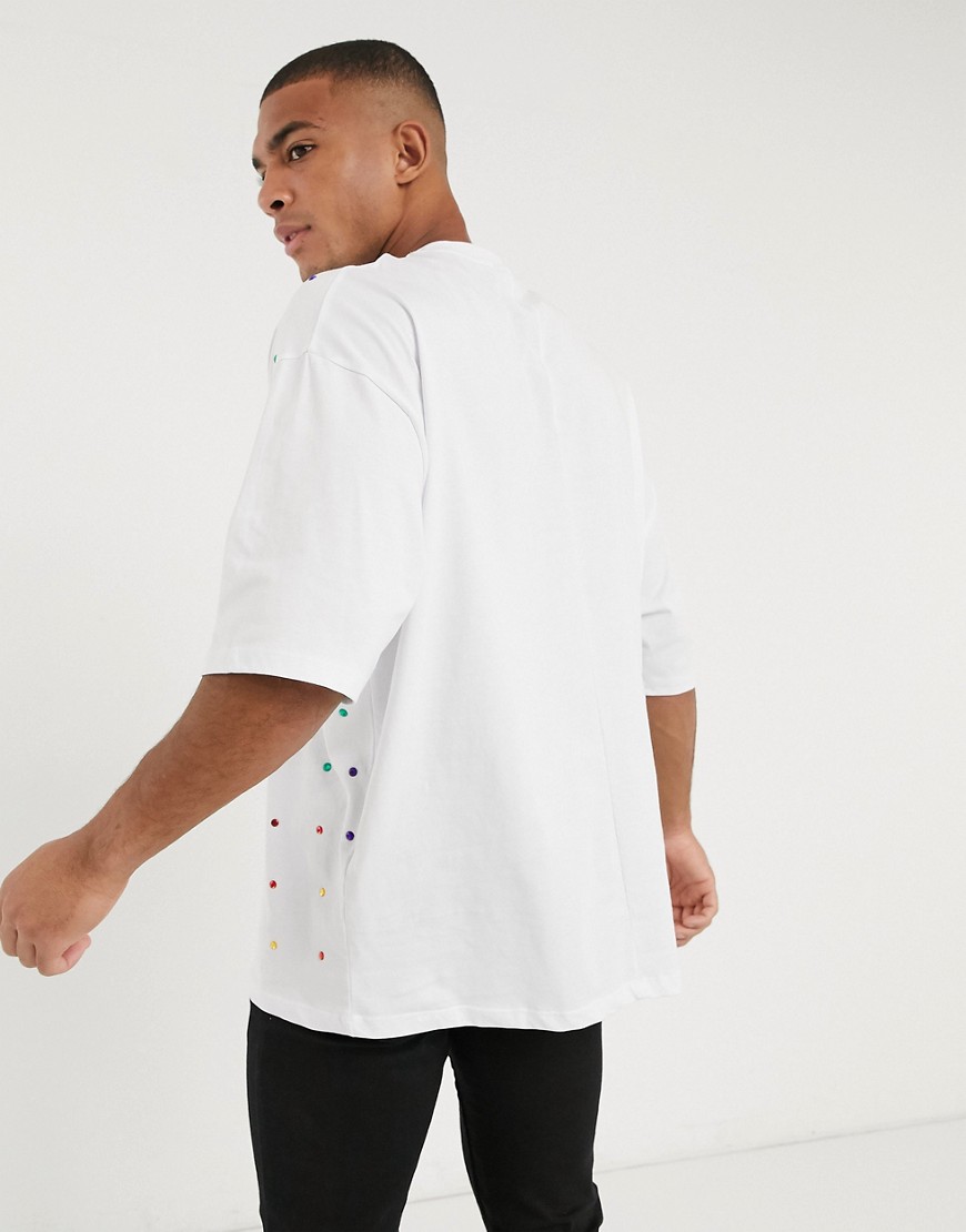T-shirt męski długi oversize z nadrukiem i koralikami biały M