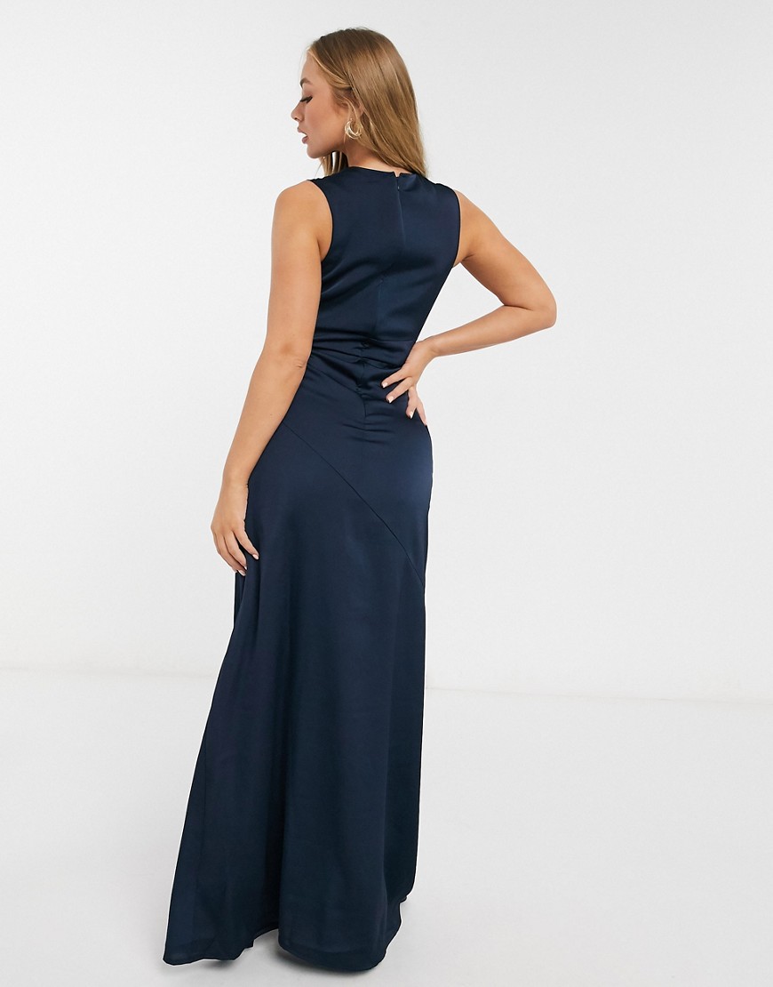 TFNC – Koktajlowa sukienka maxi z granatowej satyny z rozcięciem 44