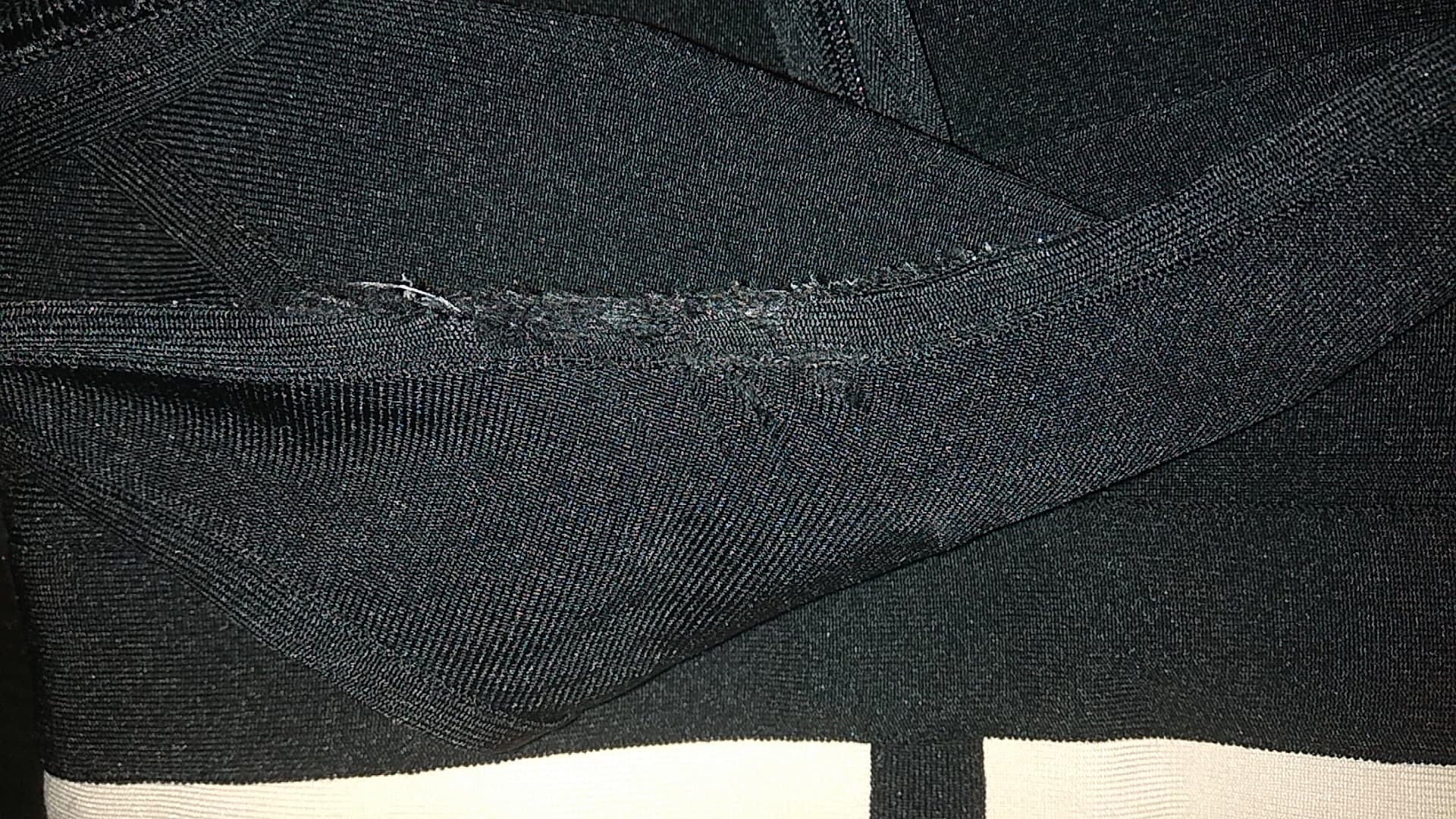 - Defekt: fabryczny defekt na szwie i na materiale u dołu przy zapięciu (zdjęcie) zmechacenie. Po założeniu spodni/spódnicy nie będize widoczne. Zapach perfum.