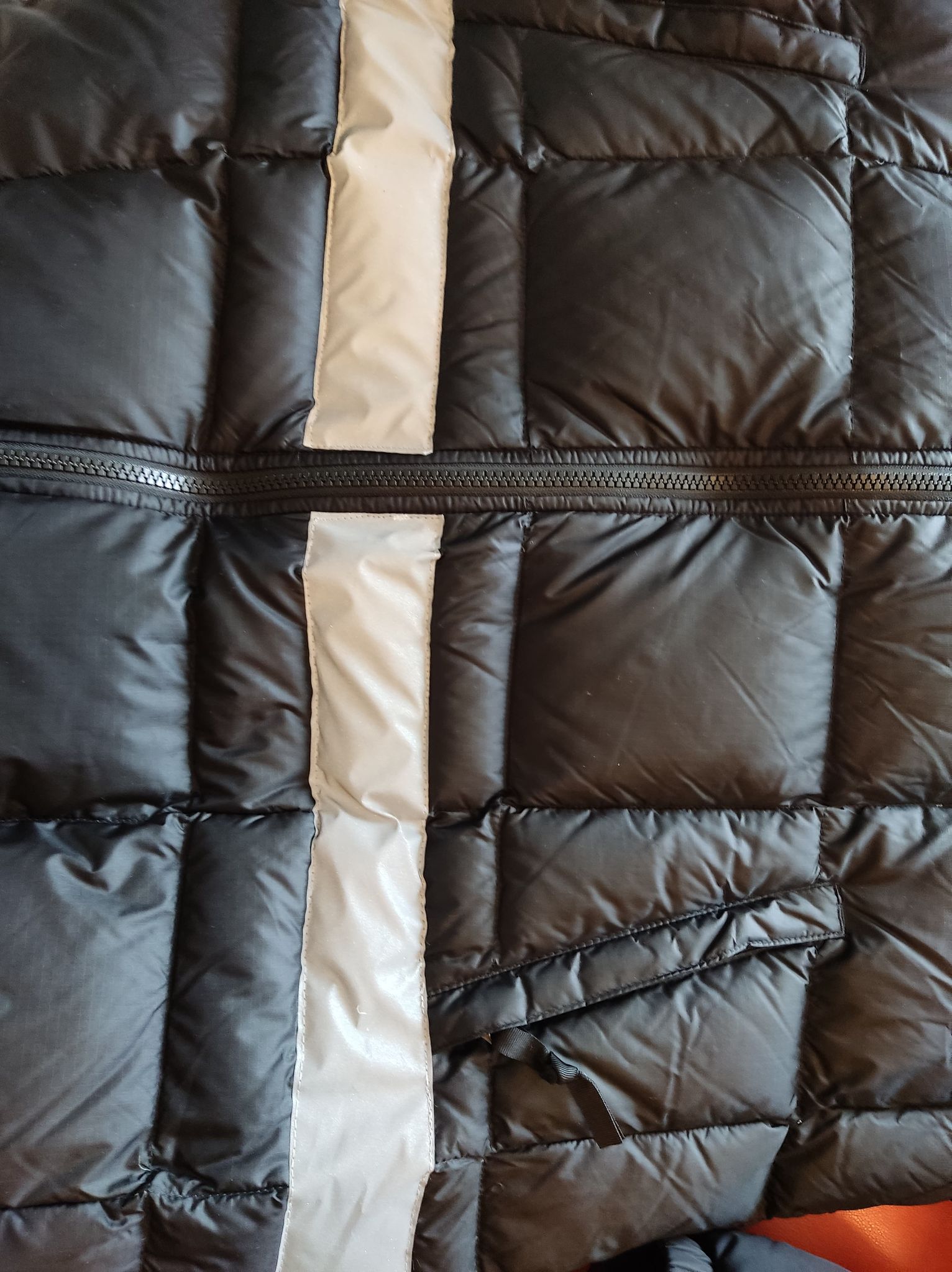 - Defekt: rozcięcie z przodu – po korekcie krawieckie doszyte odblaskowe taśmy (zdjęcie)
