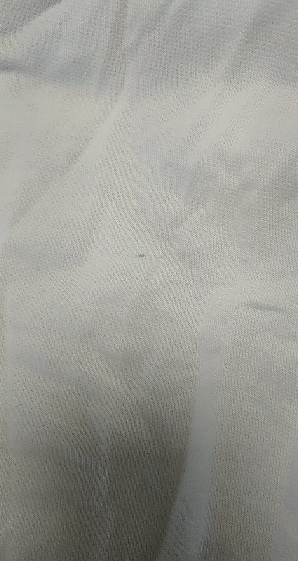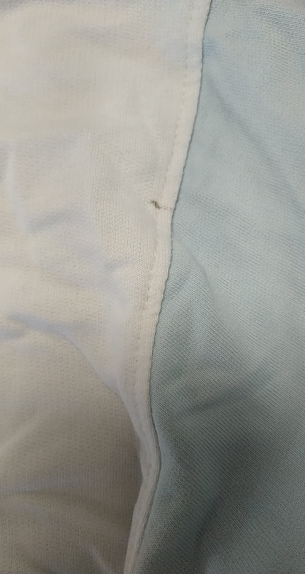 - defekt wciągnięta kolorowa nitka z przodu i zabrudzenie na szwie rękawa