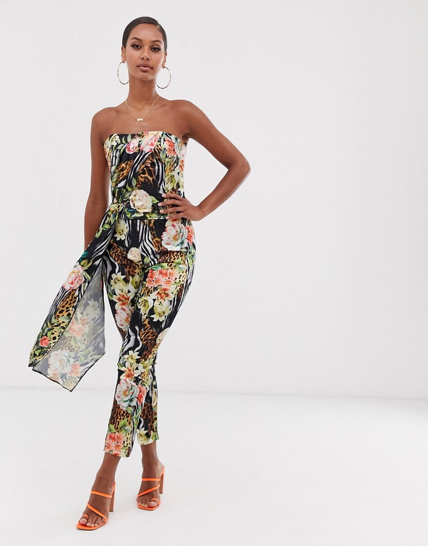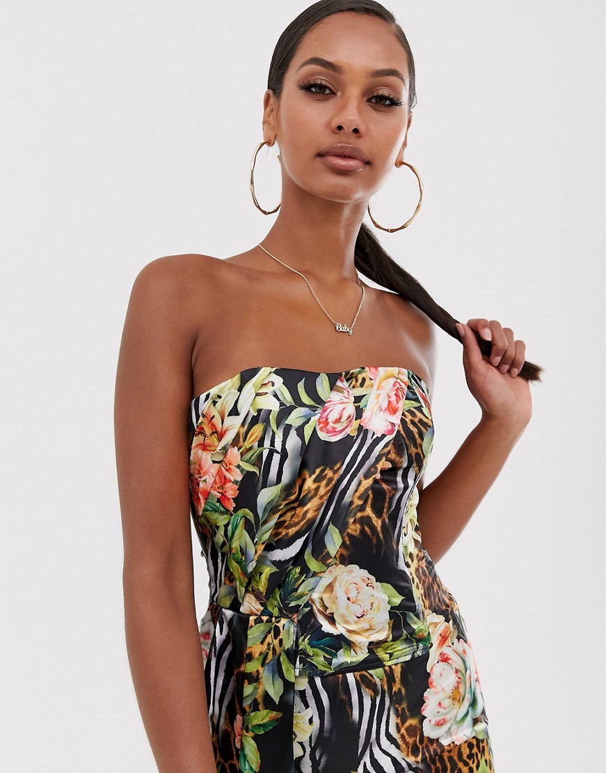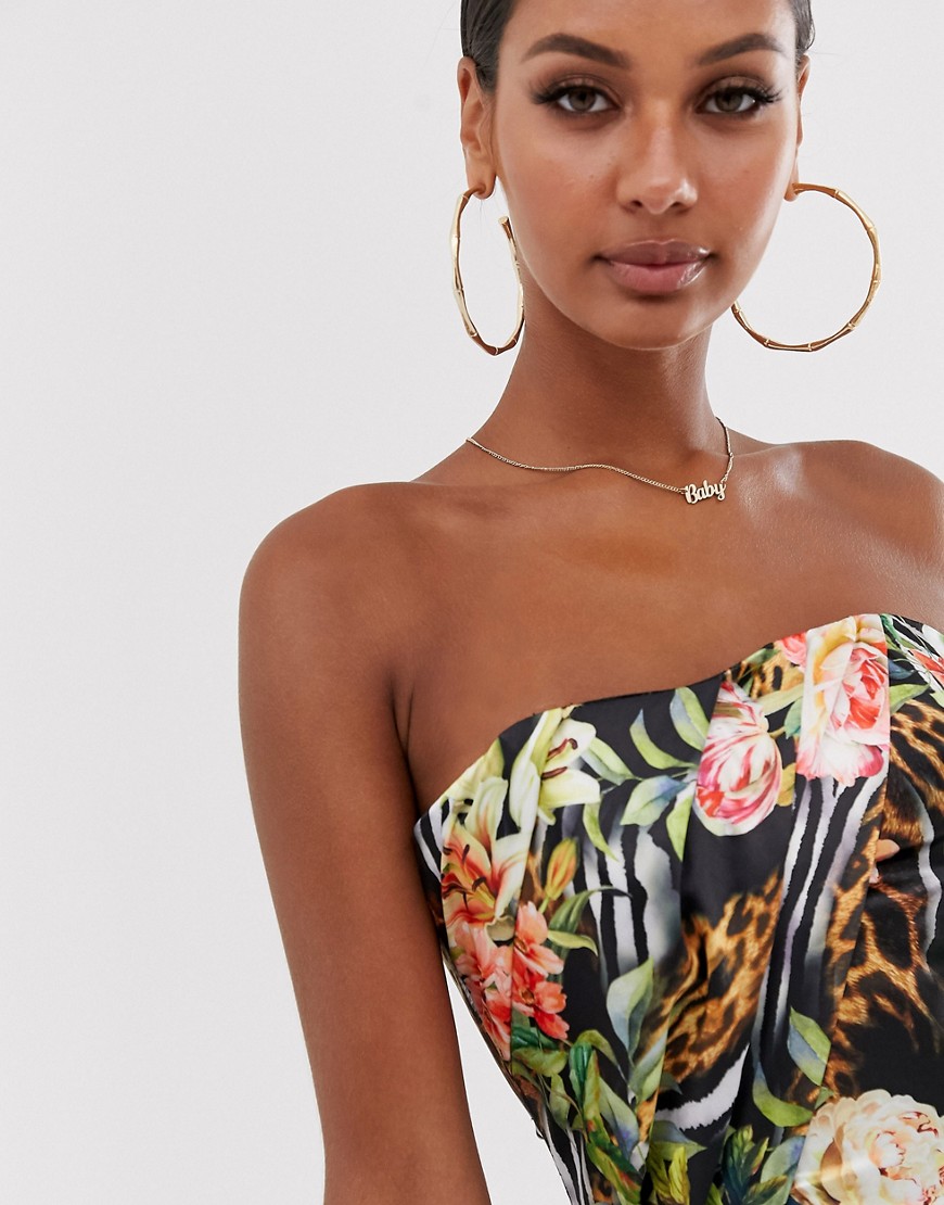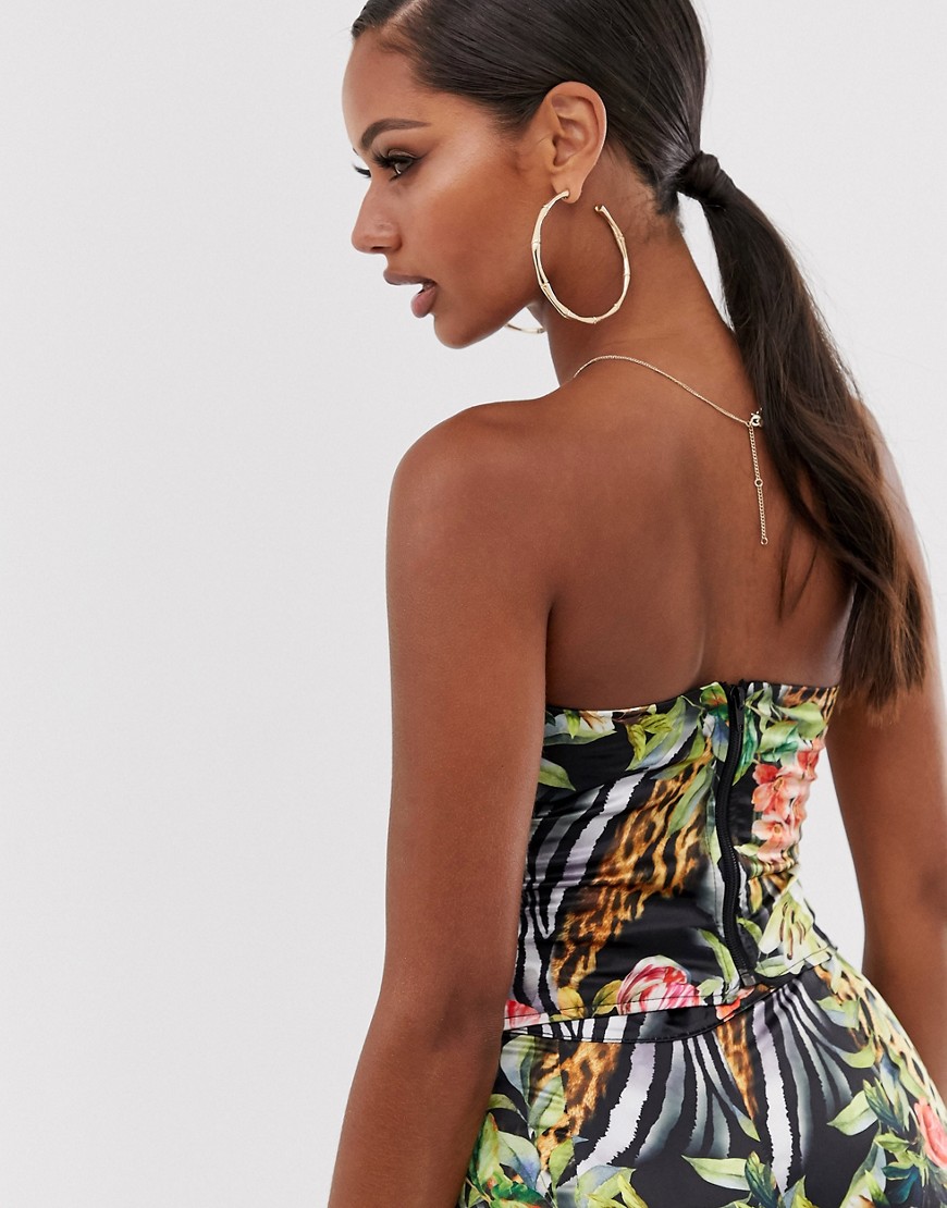 Top o skróconym kroju z dekoltem bandeau i tropikalnym nadrukiem 38