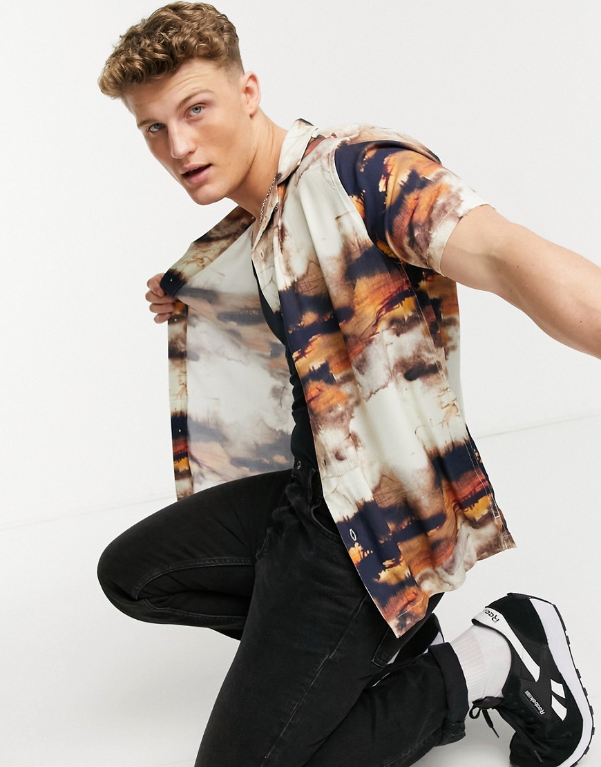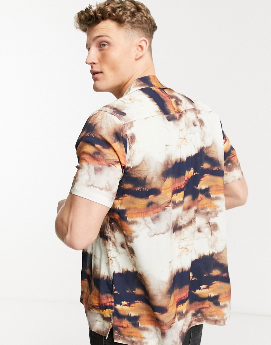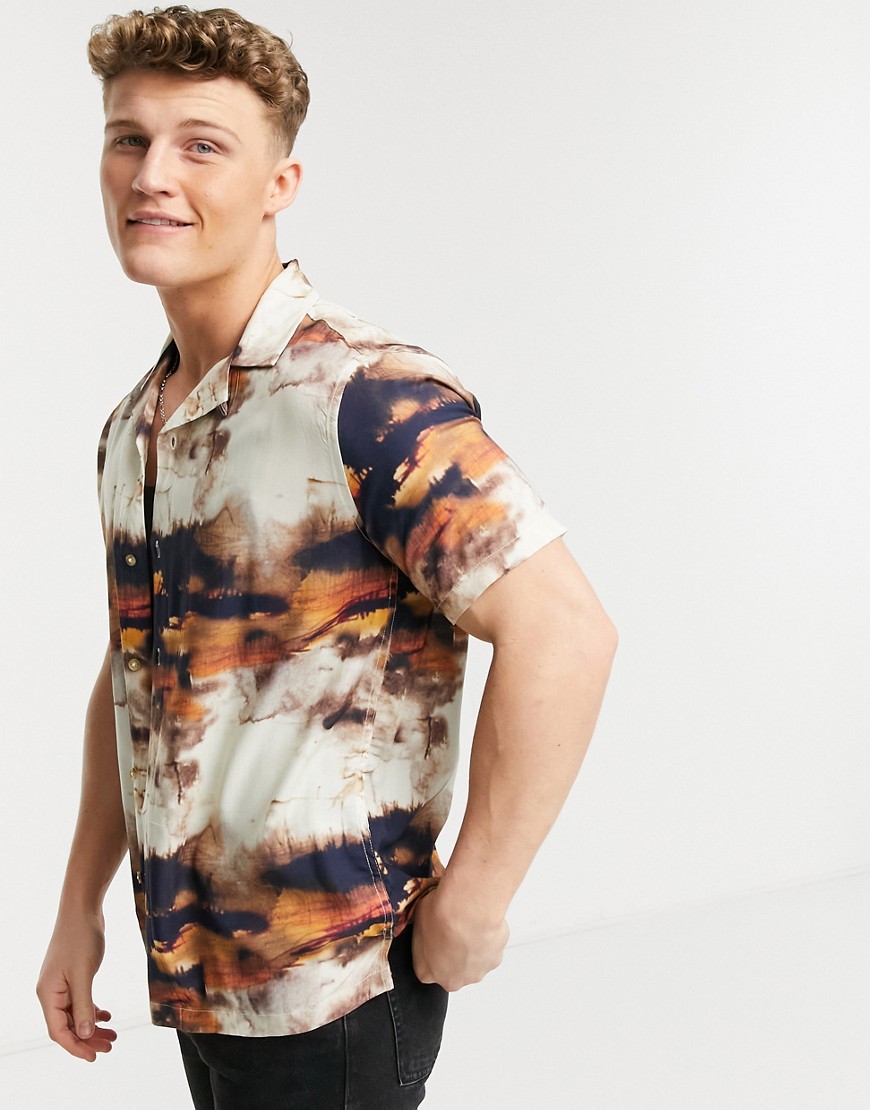 Topman dopasowana koszula z krótkim rękawem w abstrakcyjny wzór brązowa S