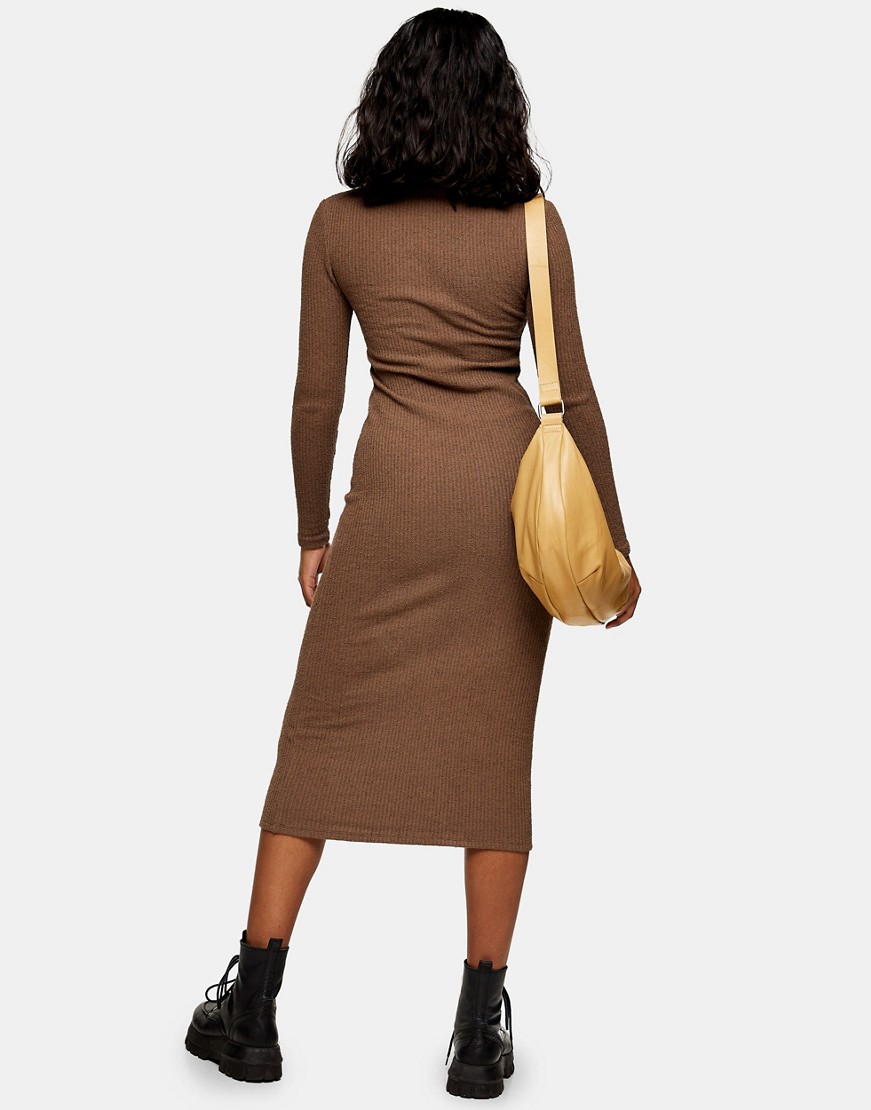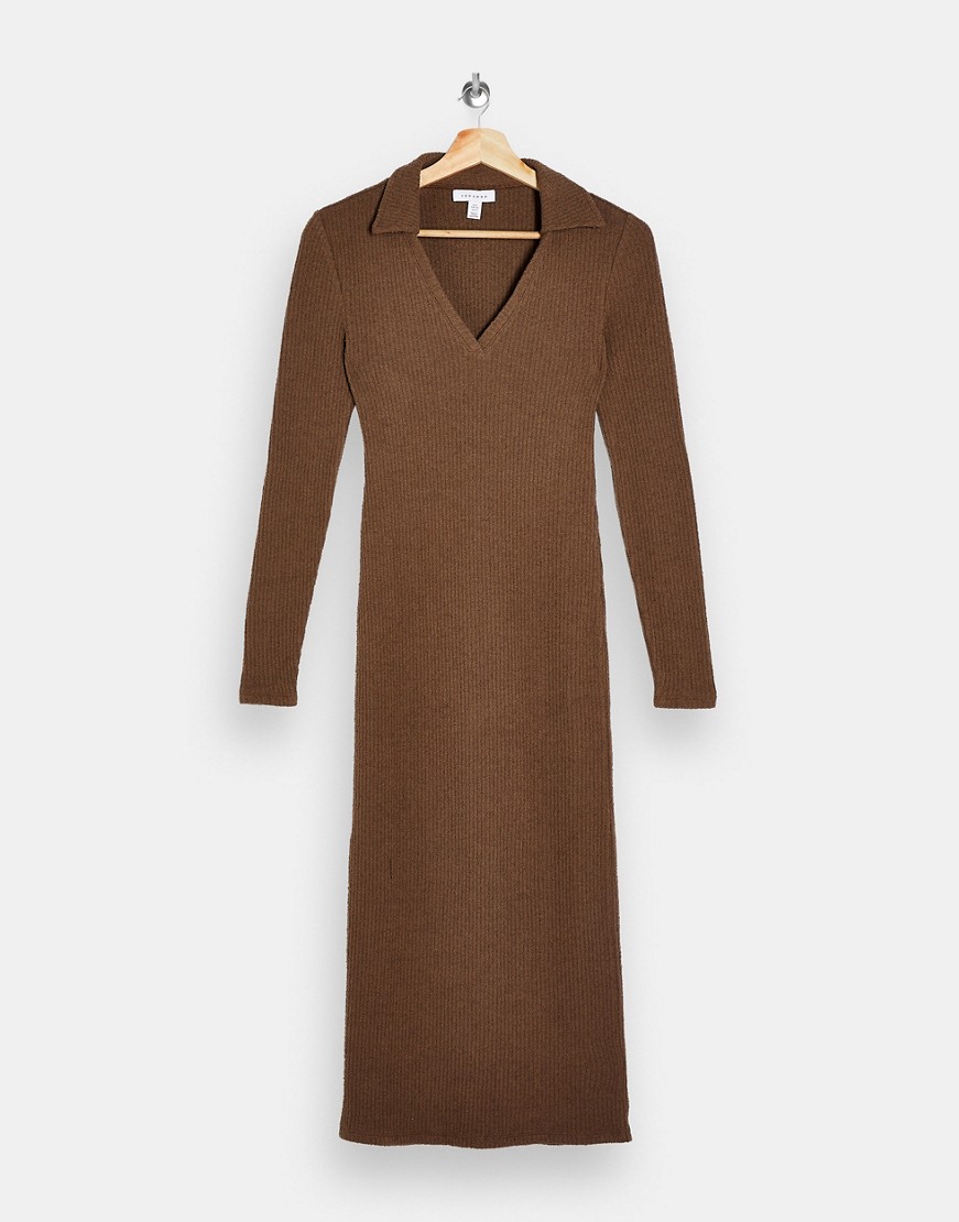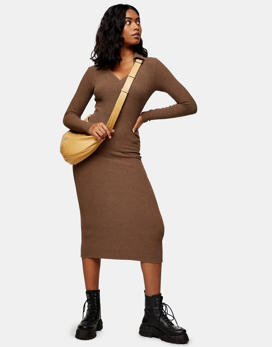Topshop ciemnobrązowa prążkowana sukienka midi z kołnierzykiem 38