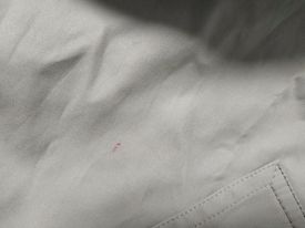 - defekt czerwone plamy na dole, przy prawej kieszeni i na pasku