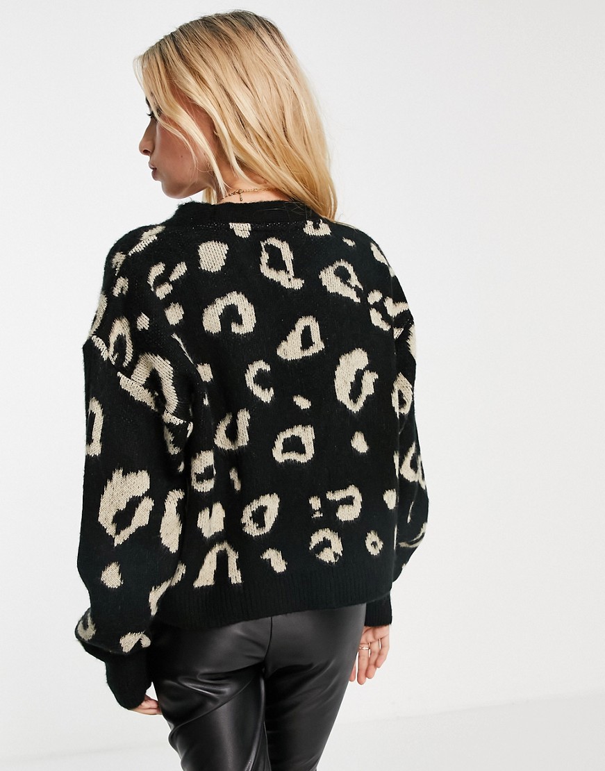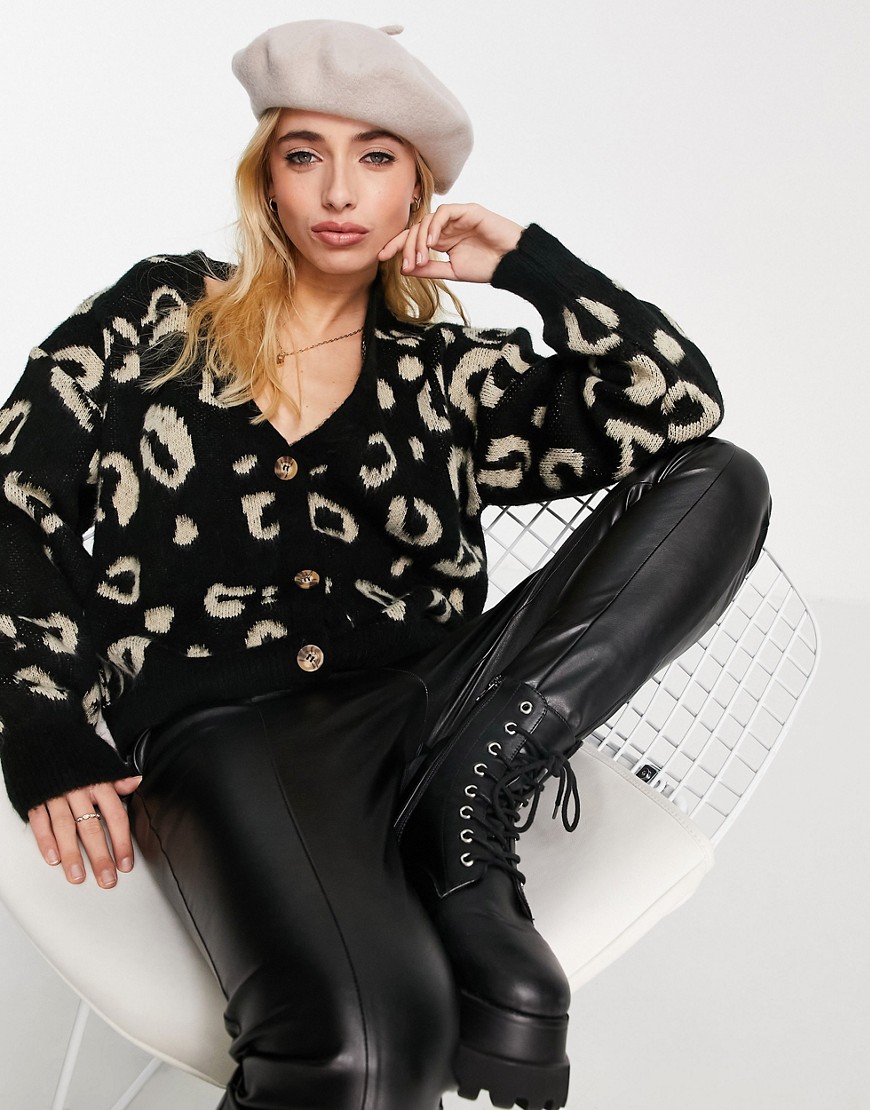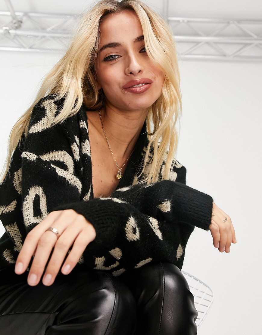 Topshop dzianinowy kardigan o pudełkowym kroju zwierzęcy wzór czarny L