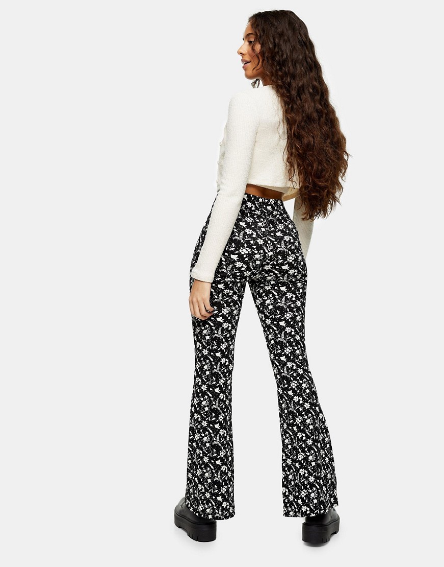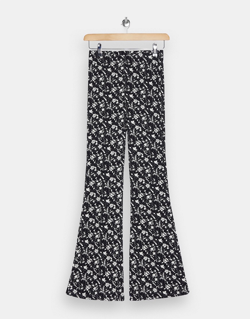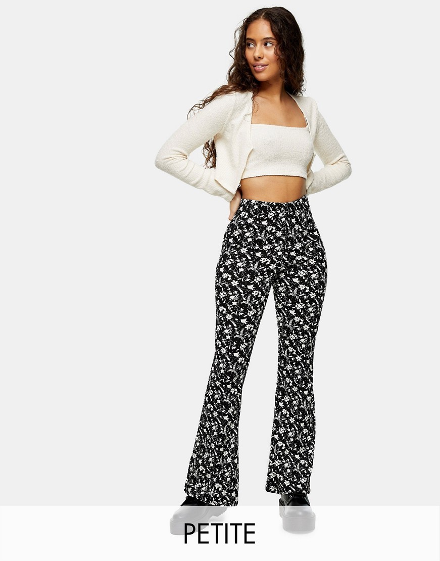 Topshop Petite – Czarne spodnie z rozszerzanymi nogawkami i wzorem w kwiaty 42