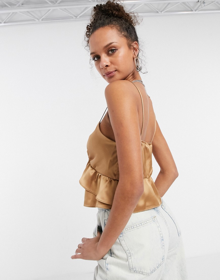 Topshop złots satynows bluzka na ramiączkach z falbankami 42