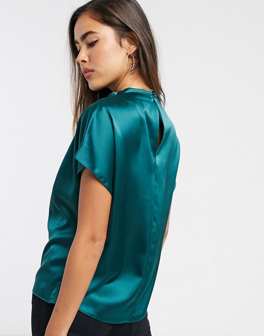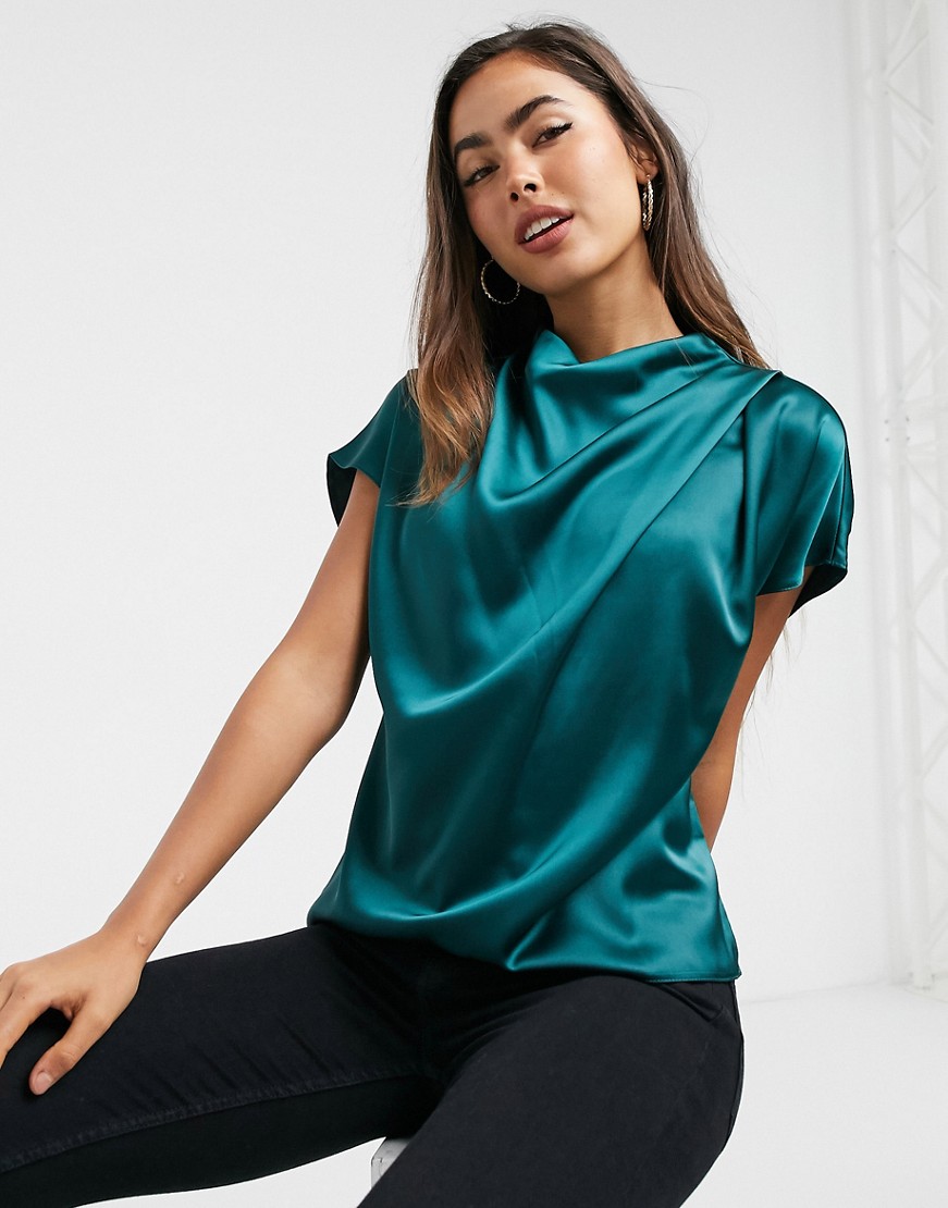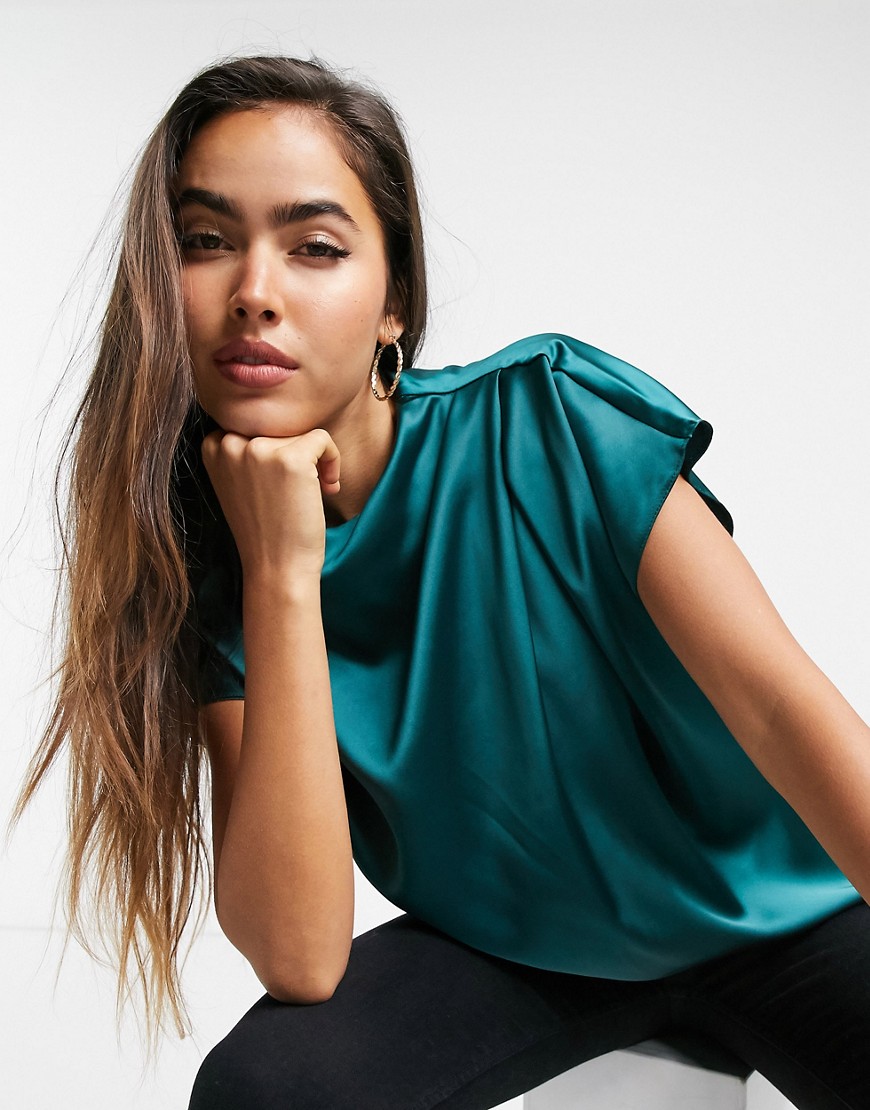 Turkusowy satynowy top z drapowanym przodem defekt 40