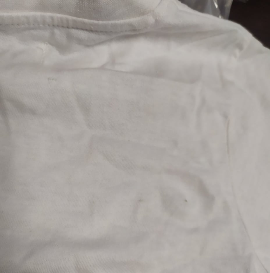 - Defekt : skaza na materiale z tyłu na plecach, zszarzała biel, zdjęcie w galerii produktu