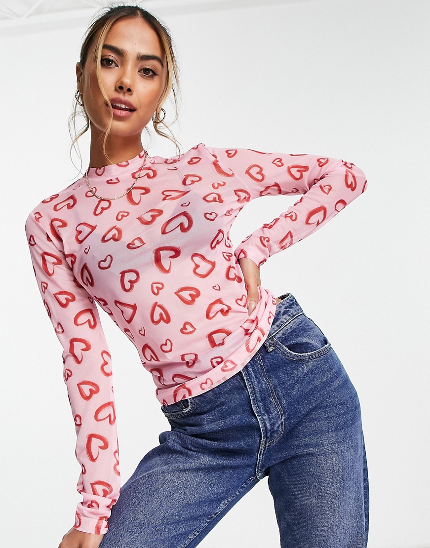 Urban Revivo Różowy t-shirt z długimi rękawami i wzorem w serca M