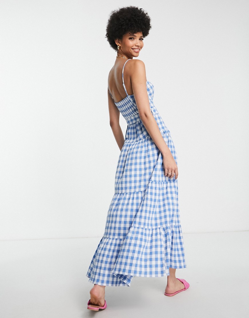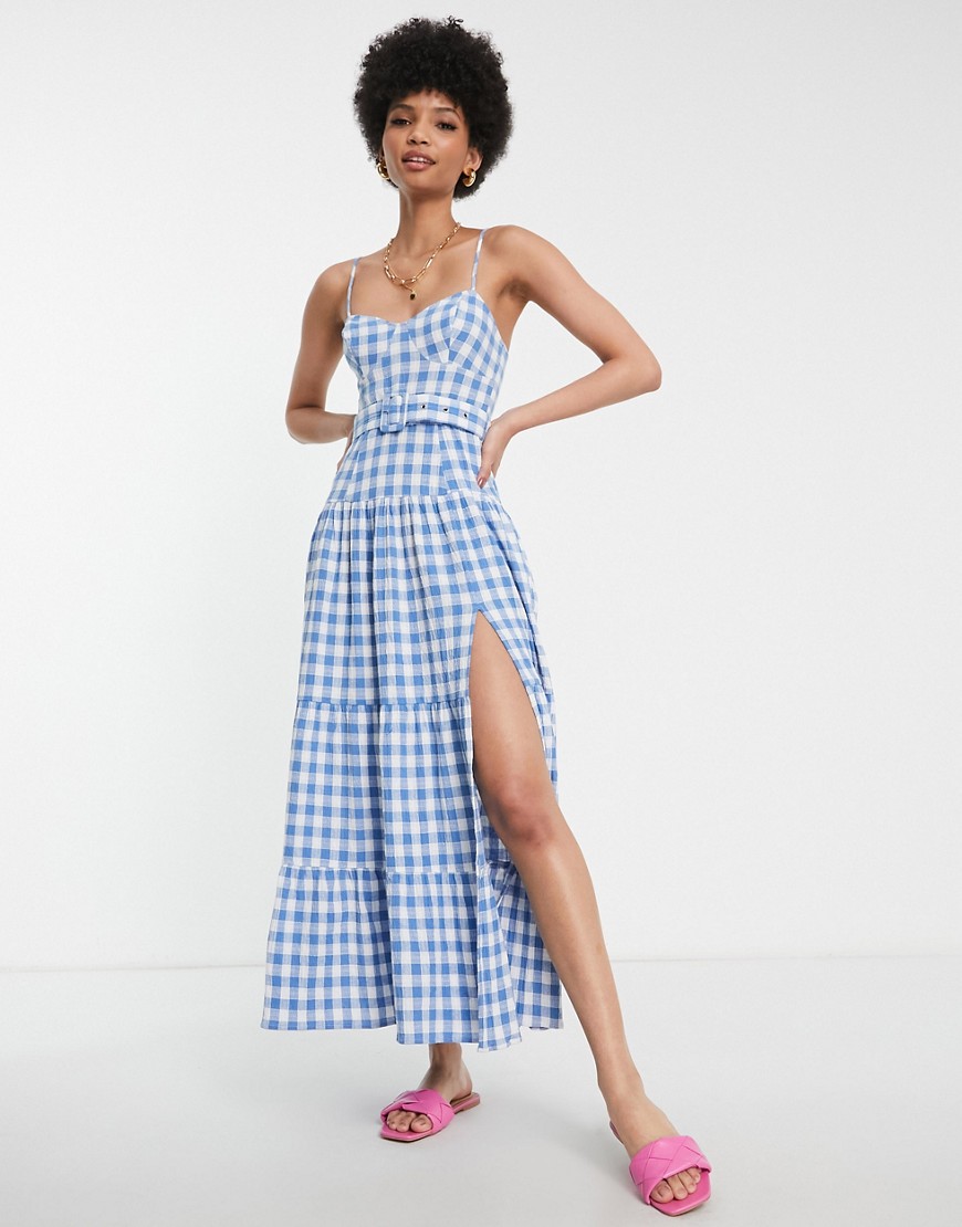 Warstwowa letnia sukienka maxi z paskiem w niebieską kratkę vichy 34