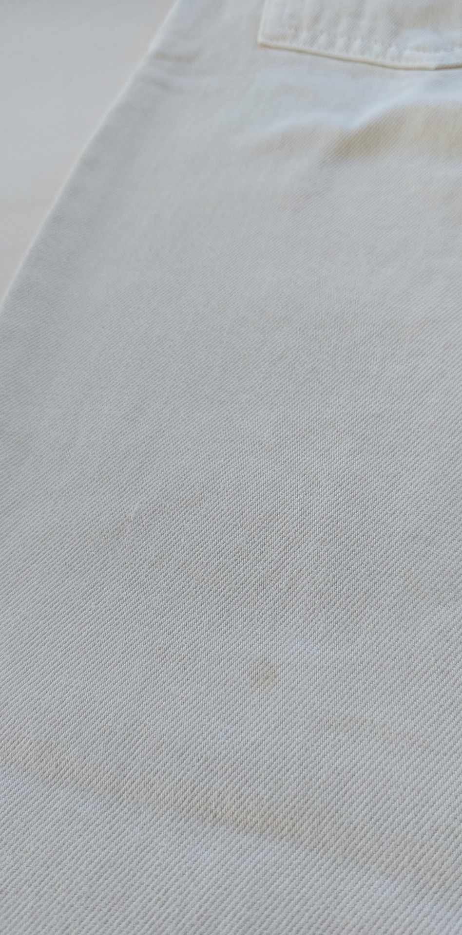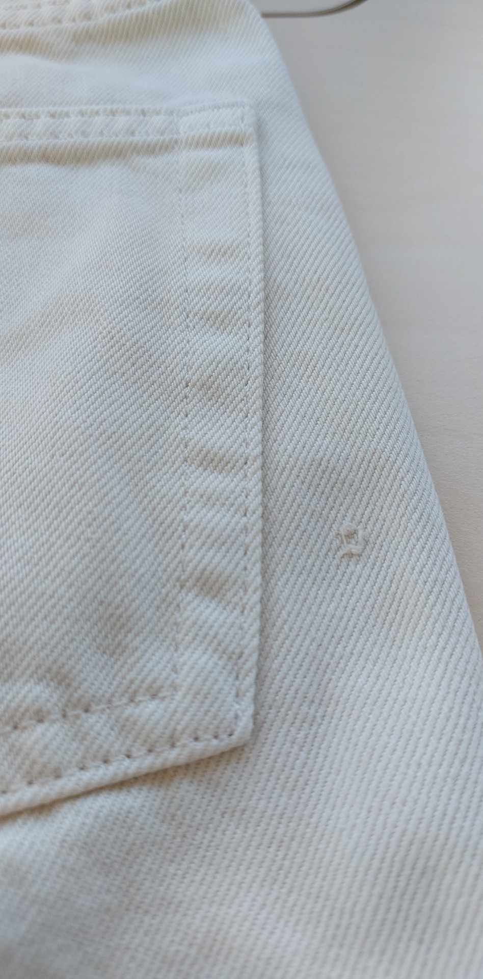 • Defekt niewielkie przetarcie z tyłu przy kieszonce, plamka na lewej nogawce z tyłu, zdjęcia w galerii produktu