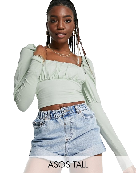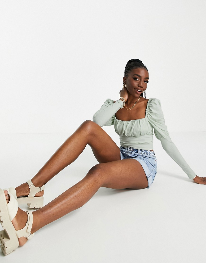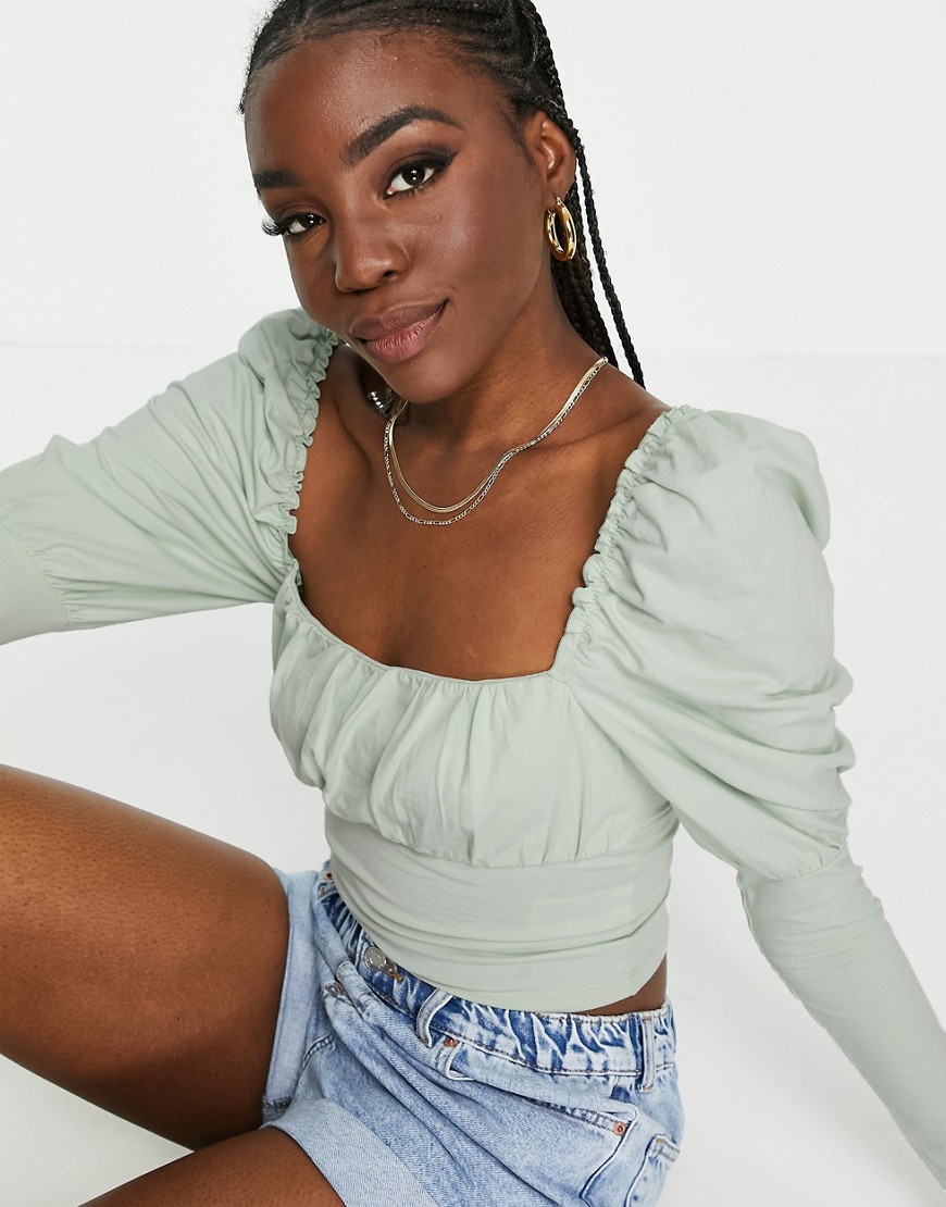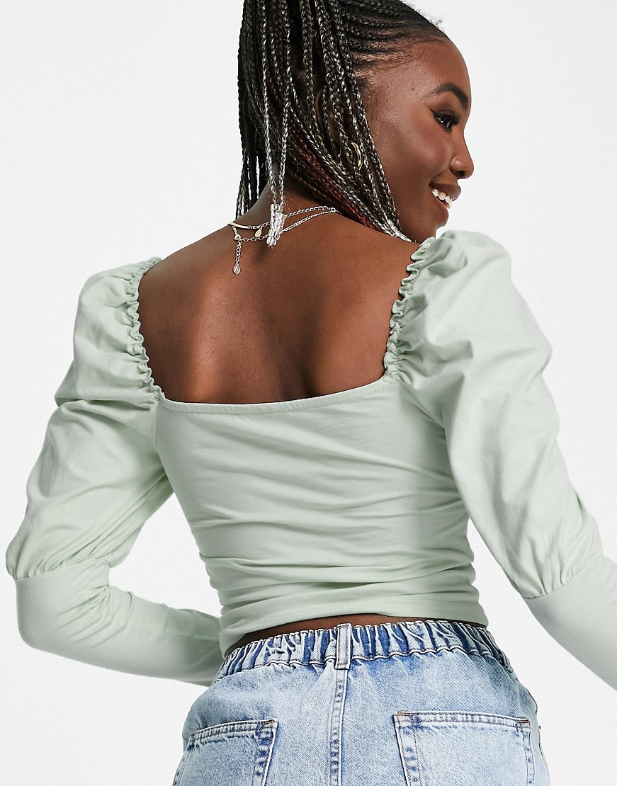 Zielona bluzka z długim rękawem bufki kwadratowy dekolt 38