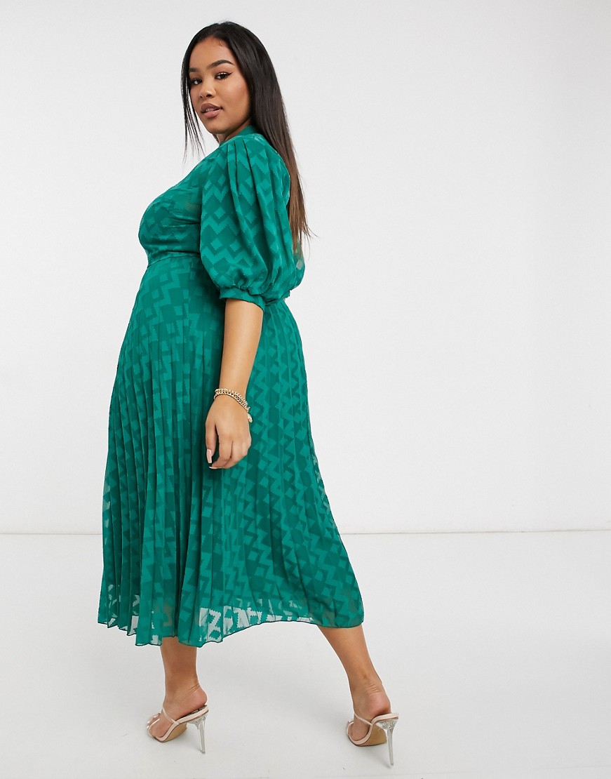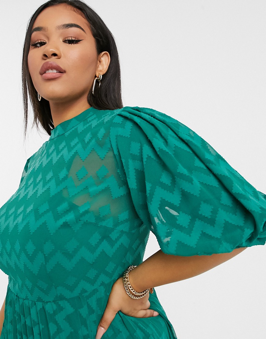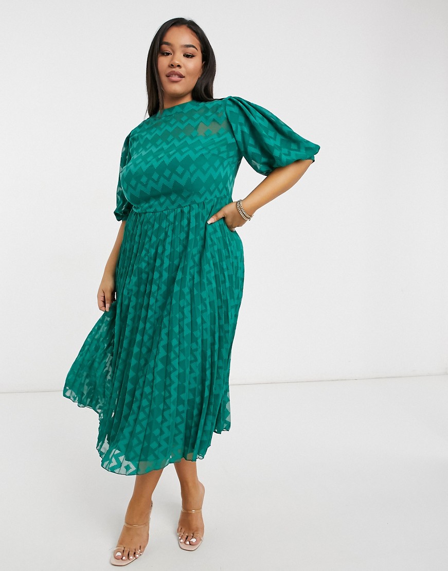 Zielona plisowana sukienka midi ze stójką, bufkami w zygzaki 44