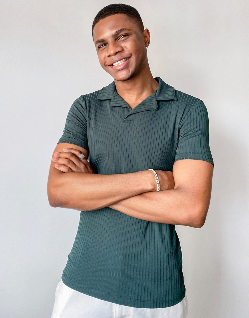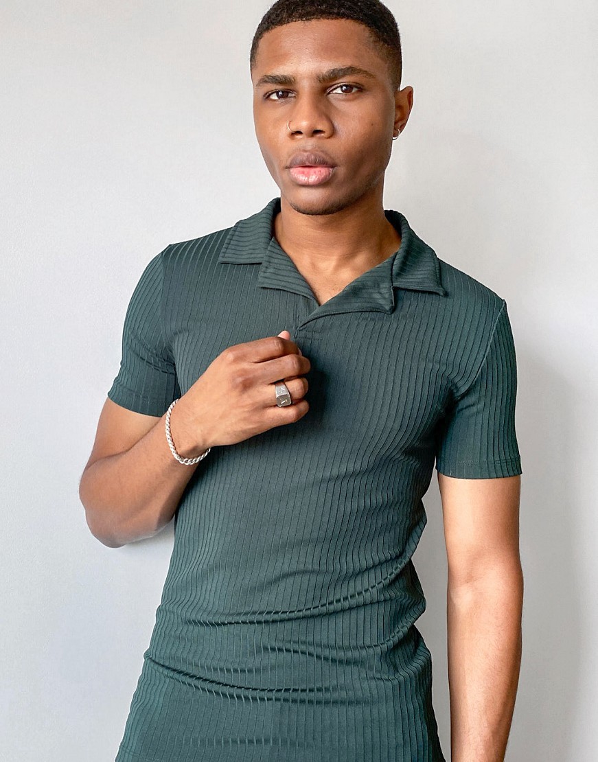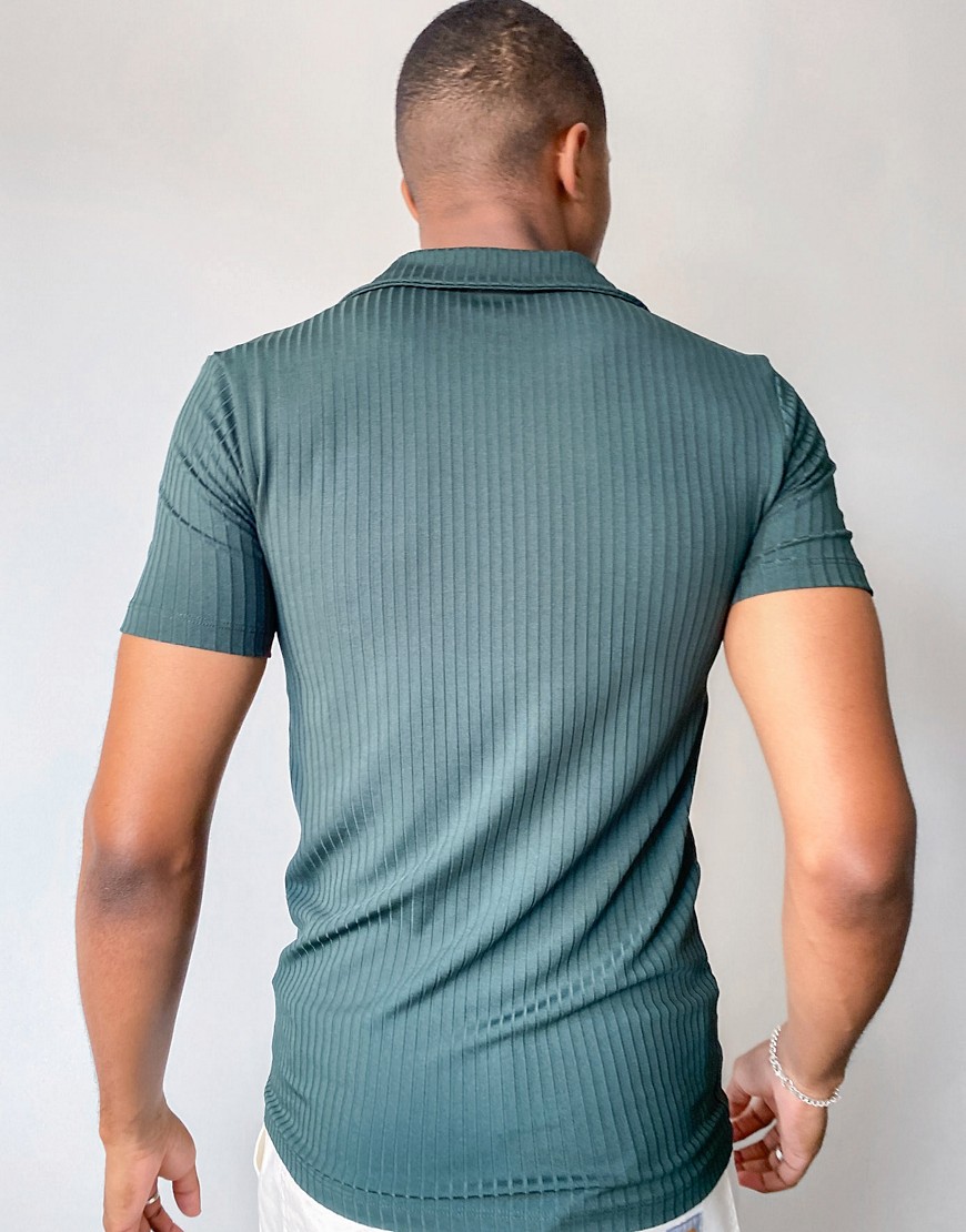 Zielona prążkowana koszulka polo z kołnierzykiem kubańskim M