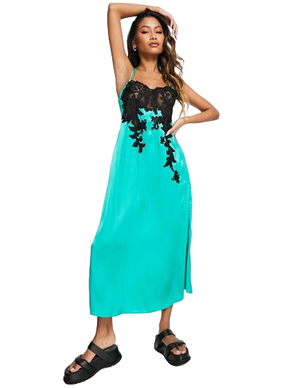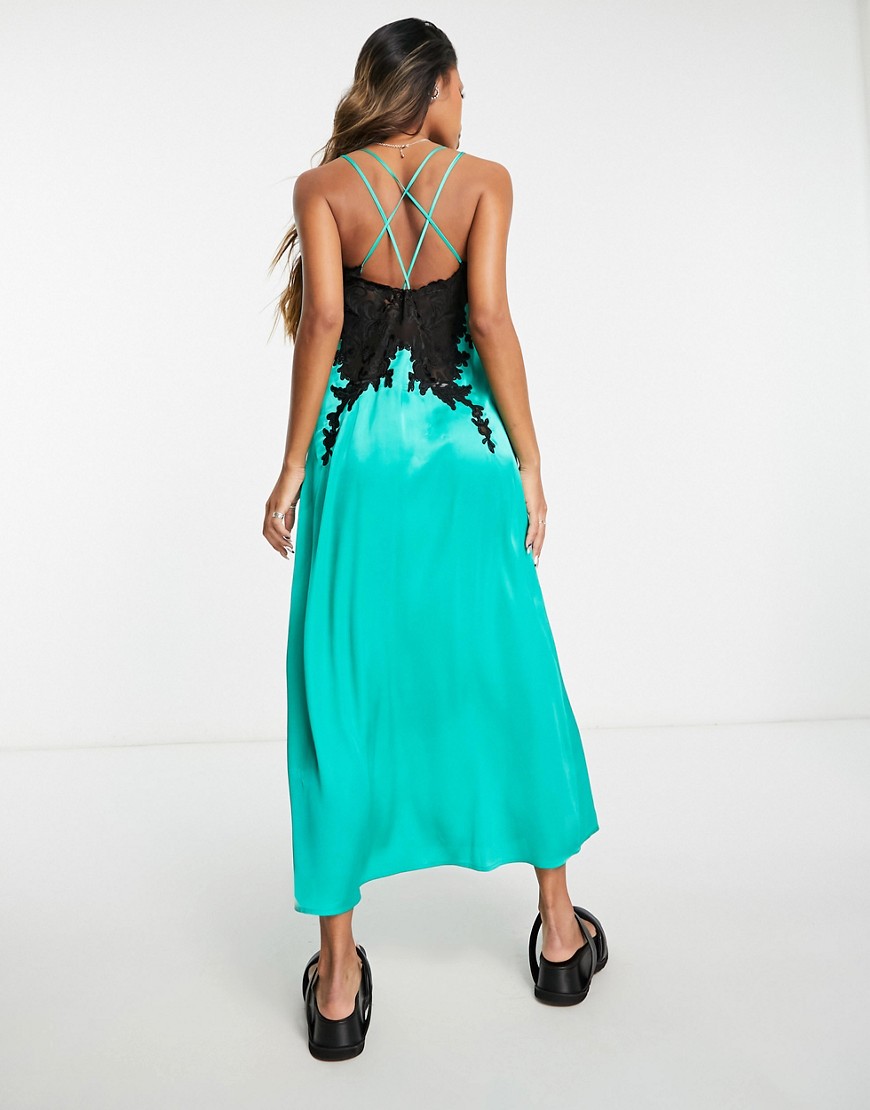 Zielona satynowa sukienka midi na ramiączkach z koronkową wstawką 34
