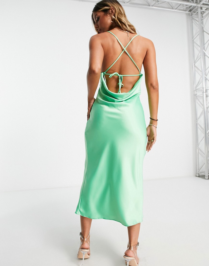 Zielona satynowa wiązana na plecach sukienka midi na ramiączkach defekt 46