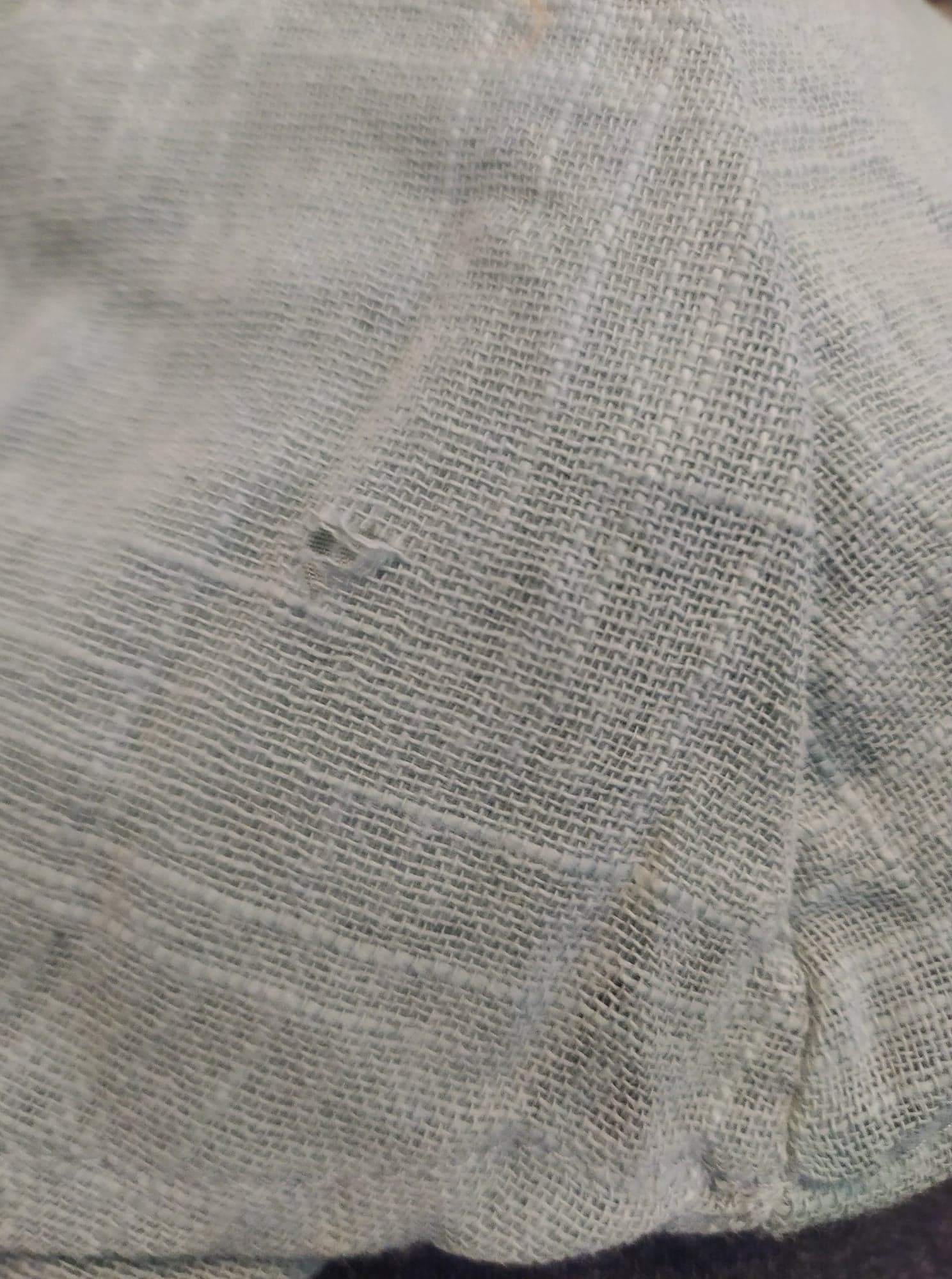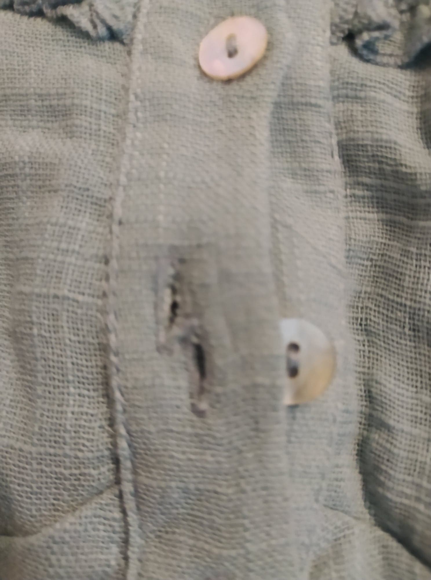 - Defekt: przy drugim guziku od góry podwójna dziurka- słabo widoczne, wystające pojedyncze nitki/drobne zaciągnięcia – słabo widoczne, dziurka na 0,5 cm, przy lewym szwie z przodu ok 5 cm od dolnej krawędzi sukienki (zdjęcia)