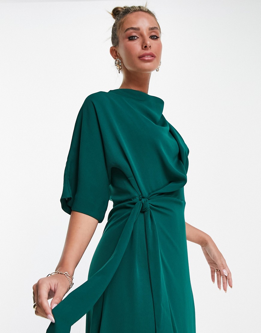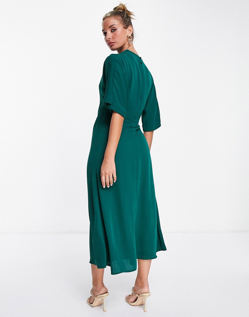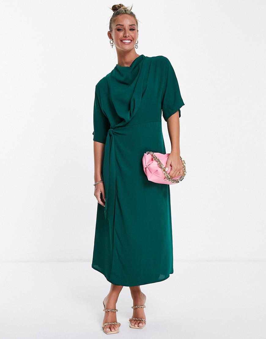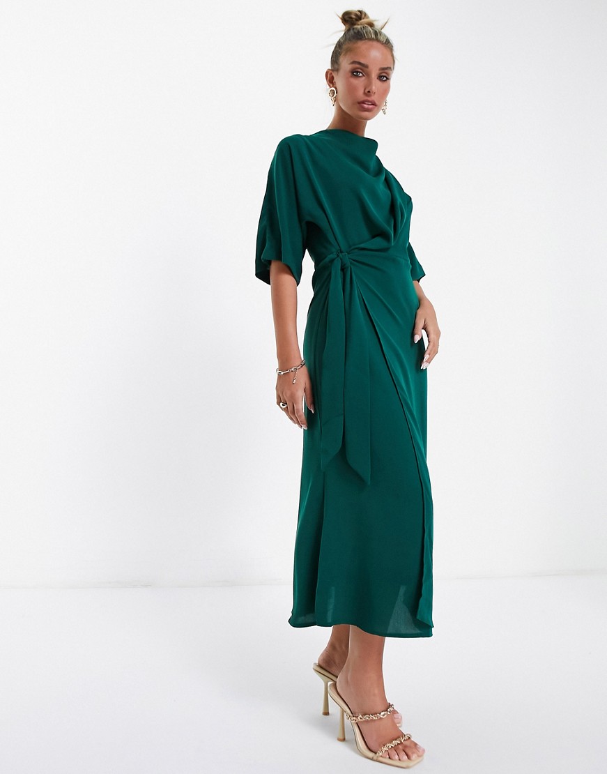 Zielona sukienka midi z szalowym kołnierzem i kopertową spódnicą 40
