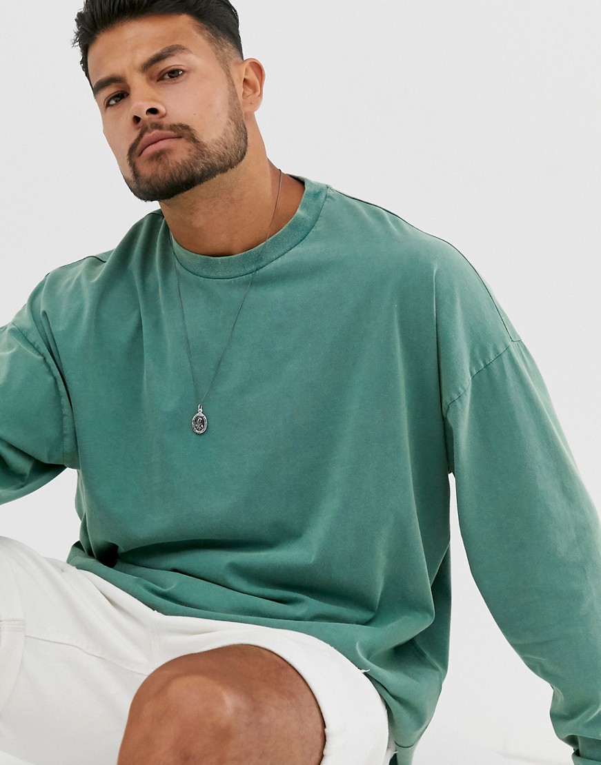 Zielony T-shirt oversize o pudełkowym kroju z długim rękawem i efektem sprania XL