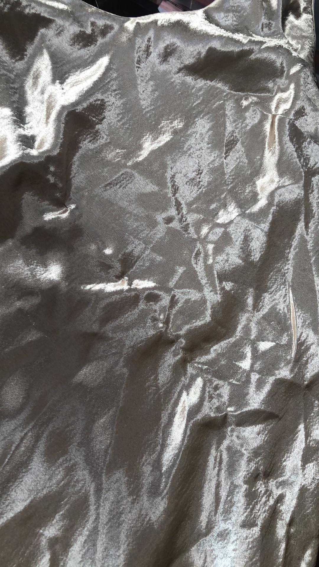 - Defekt: zaciągnięcie materiału na dekolcie wewnątrz oraz na przodzie na środku, zdjęcie w galerii
