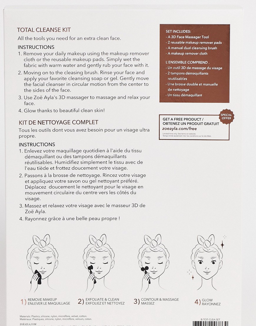 - Zawiera narzędzie do masażu, waciki do demakijażu, szczoteczkę do czyszczenia i ręcznik