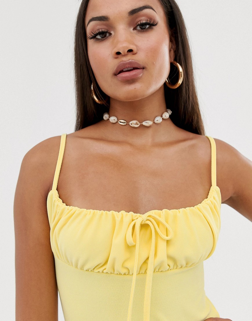 Żółta Sukienka mini dopasowana zebrana z przodu 40