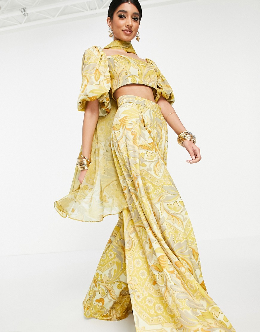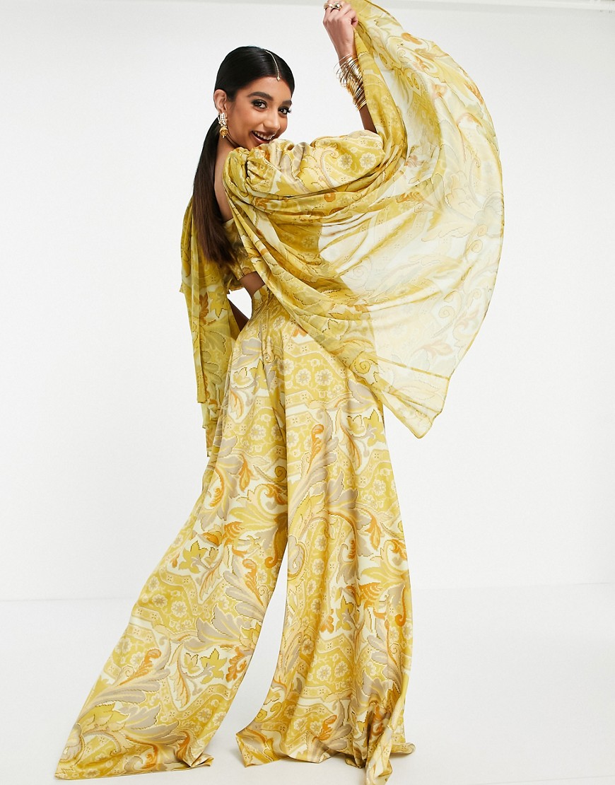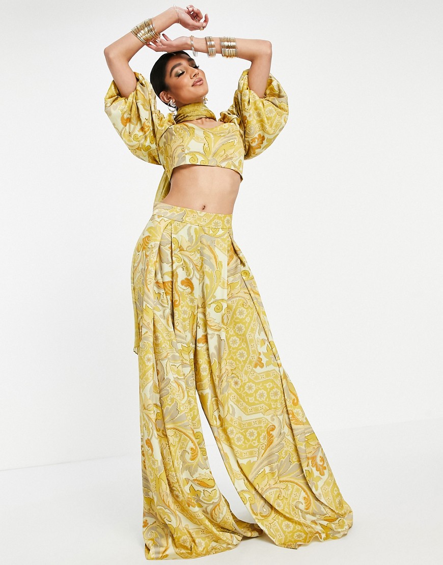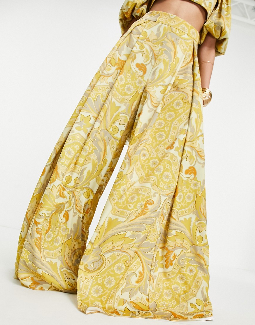 Żółte spodnie w kwiatowy wzór z szerokimi nogawkami i zakładkami z przodu defekt 46