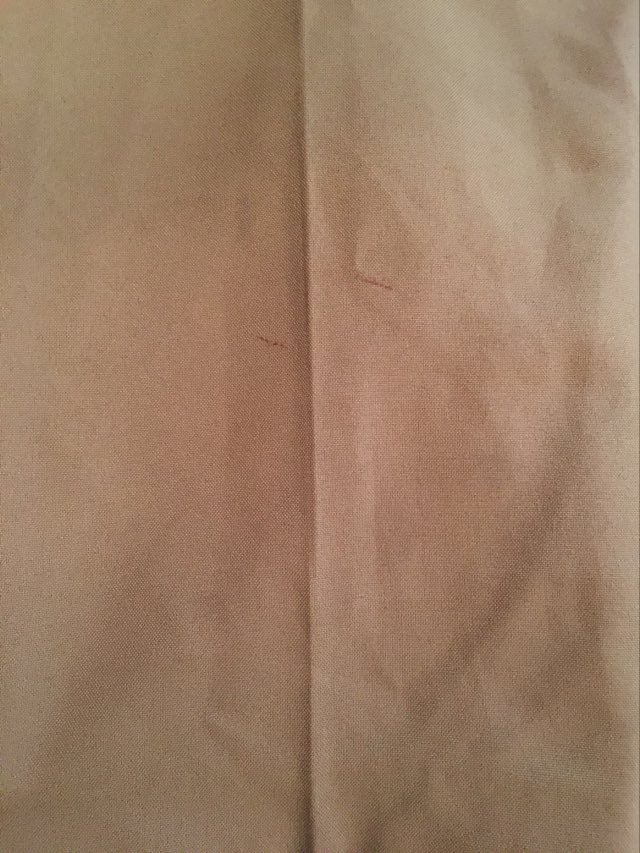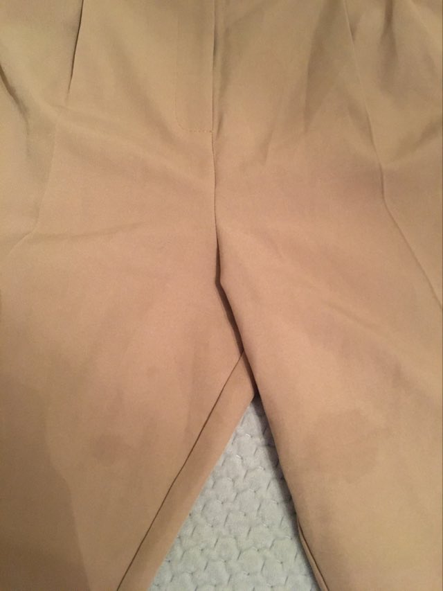• Defekt: duże plamy od wewnętrznej strony ud oraz na lewej nogawce u dołu – zdjęcia w galerii przedmiotu.